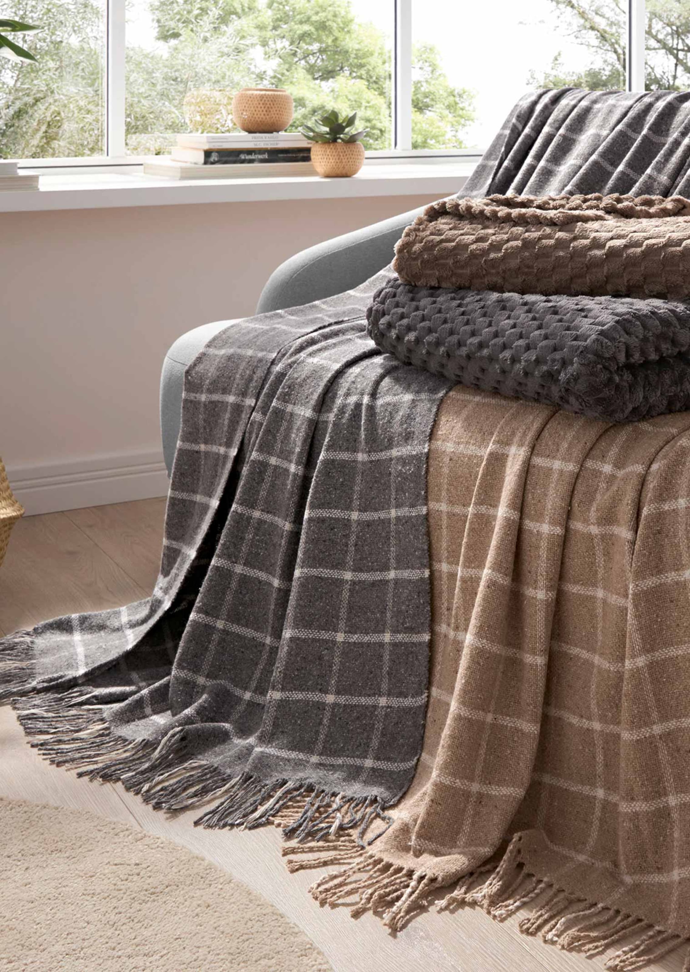 GÖZZE peitto klassisella ruutukuosilla. Muodikkaat hapsutetut reunat. Peitto pysyy hyvin paikoillaan ja se pitää sinut miellyttävän lämpimänä villapitoisuutensa ansiosta. Ihanan pehmeää materiaalisekoitusta, joka on valmistettu kierrätetyistä raaka-aineista. Hienopesu 30°C asteessa. Koko 150 x 200 cm.