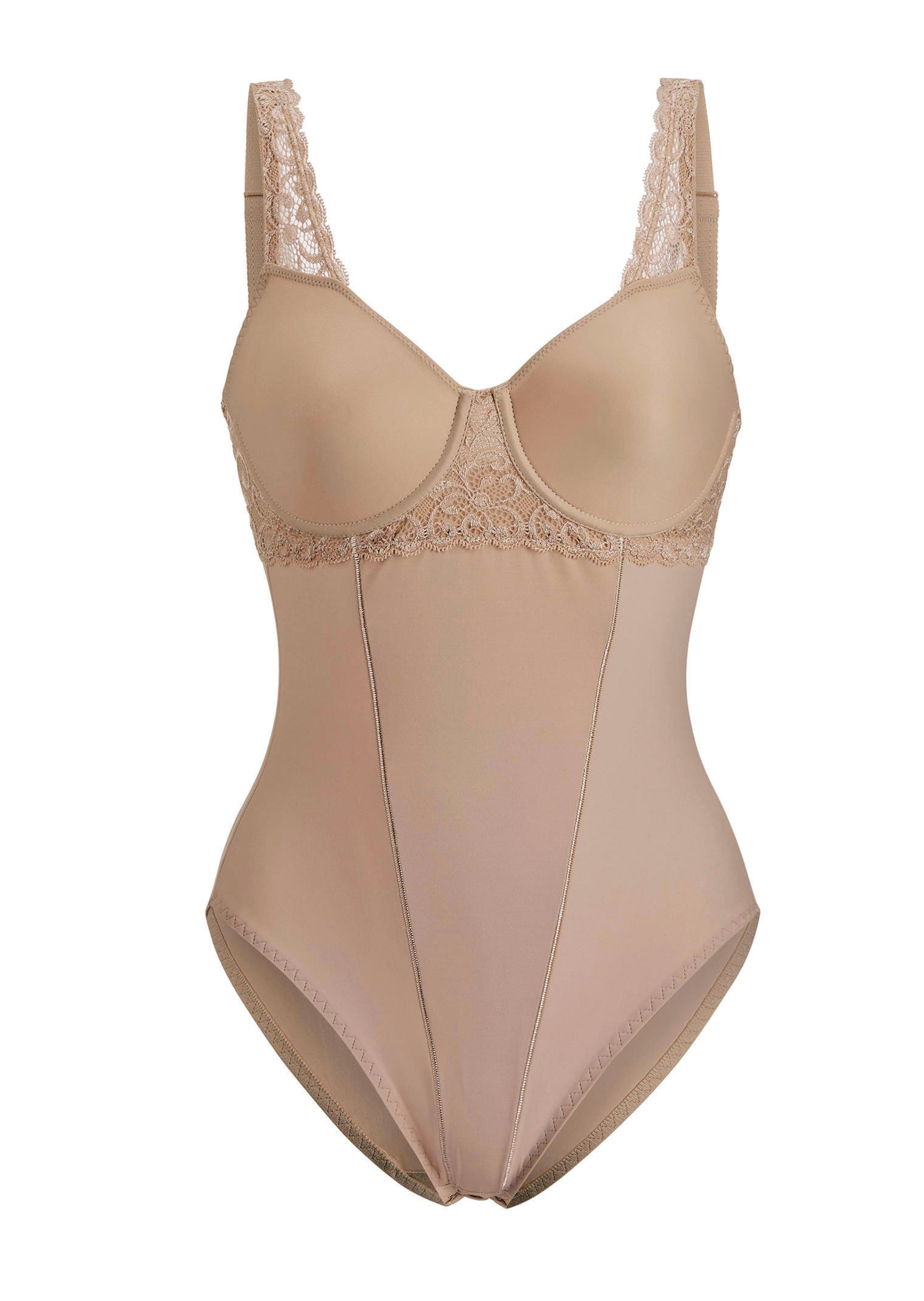 Vartaloa muokkaava minimizer body ilman kaaritukia. Tätä suosikkimallia on testattu jo usein vuosien ajan - pue päällesi ja viihdy! Toiminnallinen body pienentää povea optisesti yhden koon verran litistämättä ikävästi ja antaa vartalolle kauniit linjat. Integroidut kaarituet tuovat lisää tukea. Tyylikkäät saumat ja vahvistettu etuosa muokkaavat hoikat linjat ja pidentävät vartaloa. Somaa pitsikoristelua ja ihanan pehmeät jalantiet, jotka eivät painu ikävästi ihoon. Mukavat olkaimet eivät myöskään jätä olalle epämiellyttäviä painaumia.