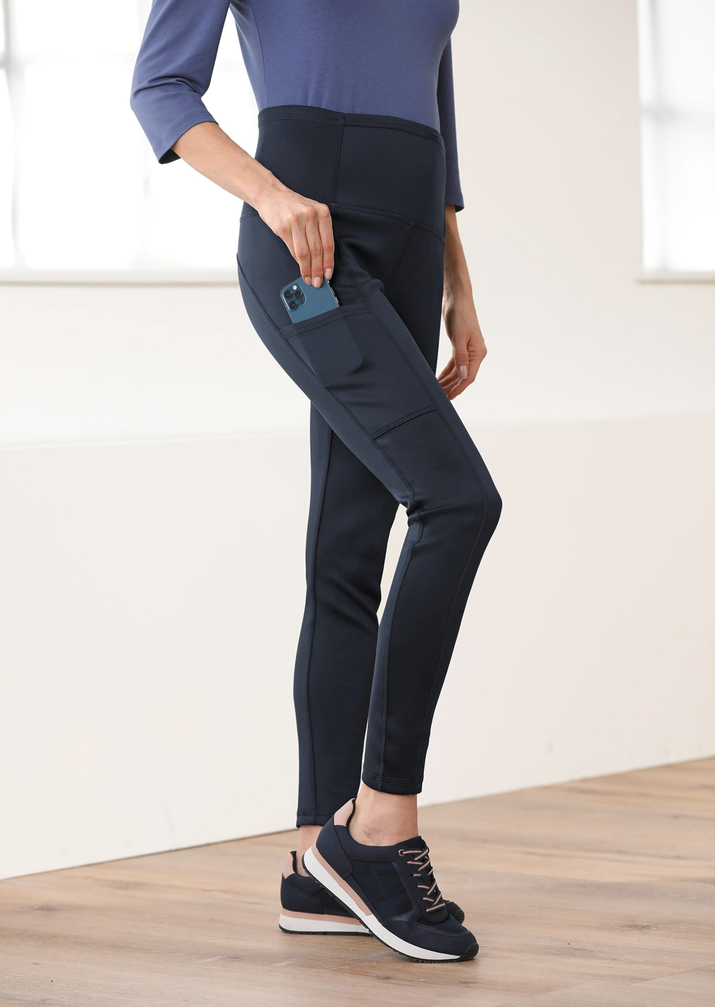 Muotoilevat leggingsit, joissa shaping-efekti. Laadukas interlockneulos elastaanin kera muokkaa sääriä, ja useat muoto-ompeleet tehostavat vartalolle eduksi olevaa vaikutelmaa. Todella joustavat, helppohoitoiset ja nopeasti kuivuvat. Korkea, kaksinkertainen muotoileva vyötärökaitale. Kätevä detalji: sivulla on tasku kännykälle ja sisäpuolella vyötärökaitaleessa kolikkotasku.