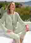 « J’aime quand les tons pastel se répondent avec délicatesse. Ici, le pantalon clair pose une base douce et lumineuse, idéale pour révéler toute l’expressivité du haut et de son imprimé raffiné. Le cardigan en coton, léger et agréable à porter, séduit par sa structure ajourée pleine de finesse. Porté ouvert, l’ensemble gagne en naturel et en décontraction. De subtils reflets sur les boutons et de sobres ballerines viennent signer la silhouette d’une élégance tout en douceur. »
