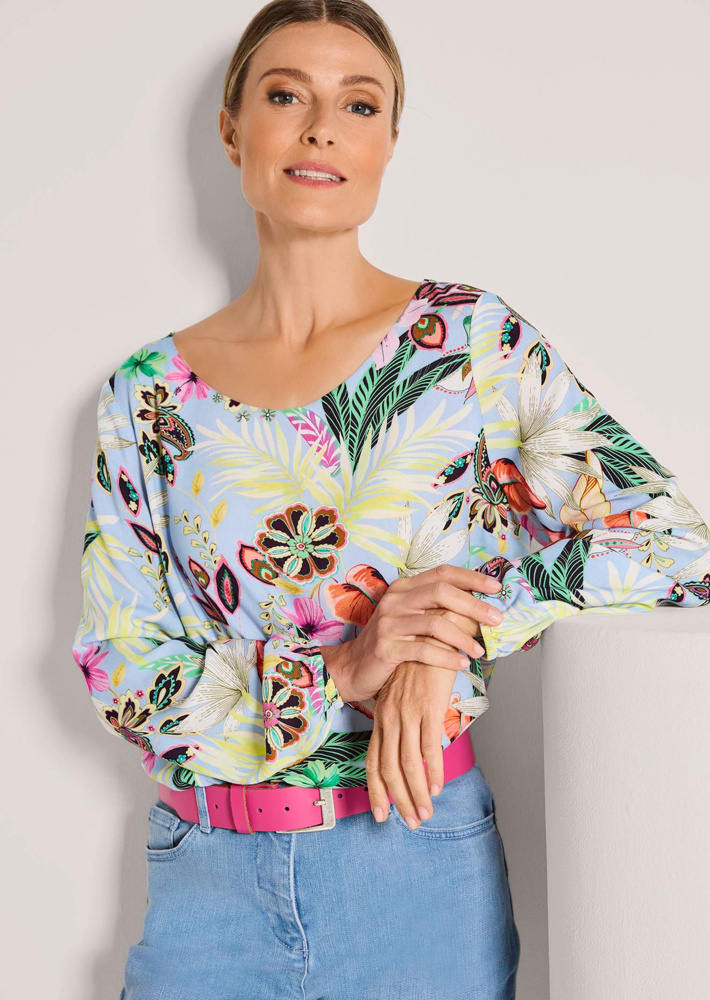 Blouse en pure viscose ultra-douce et légère, très agréable à porter. Coupe décontractée, flatteuse, qui sublime la féminité avec brio. Facile à combiner, cette blouse s’accommode des tenues les plus variées… Manches longues par temps frais ou manches retroussées par beaux temps… Les bords extensibles pratiques permettent de varier les styles selon la météo et les envies. Encolure arrondie. Imprimé floral généreux. Longueur env. 67 cm en 46, env. 63 cm en 23.