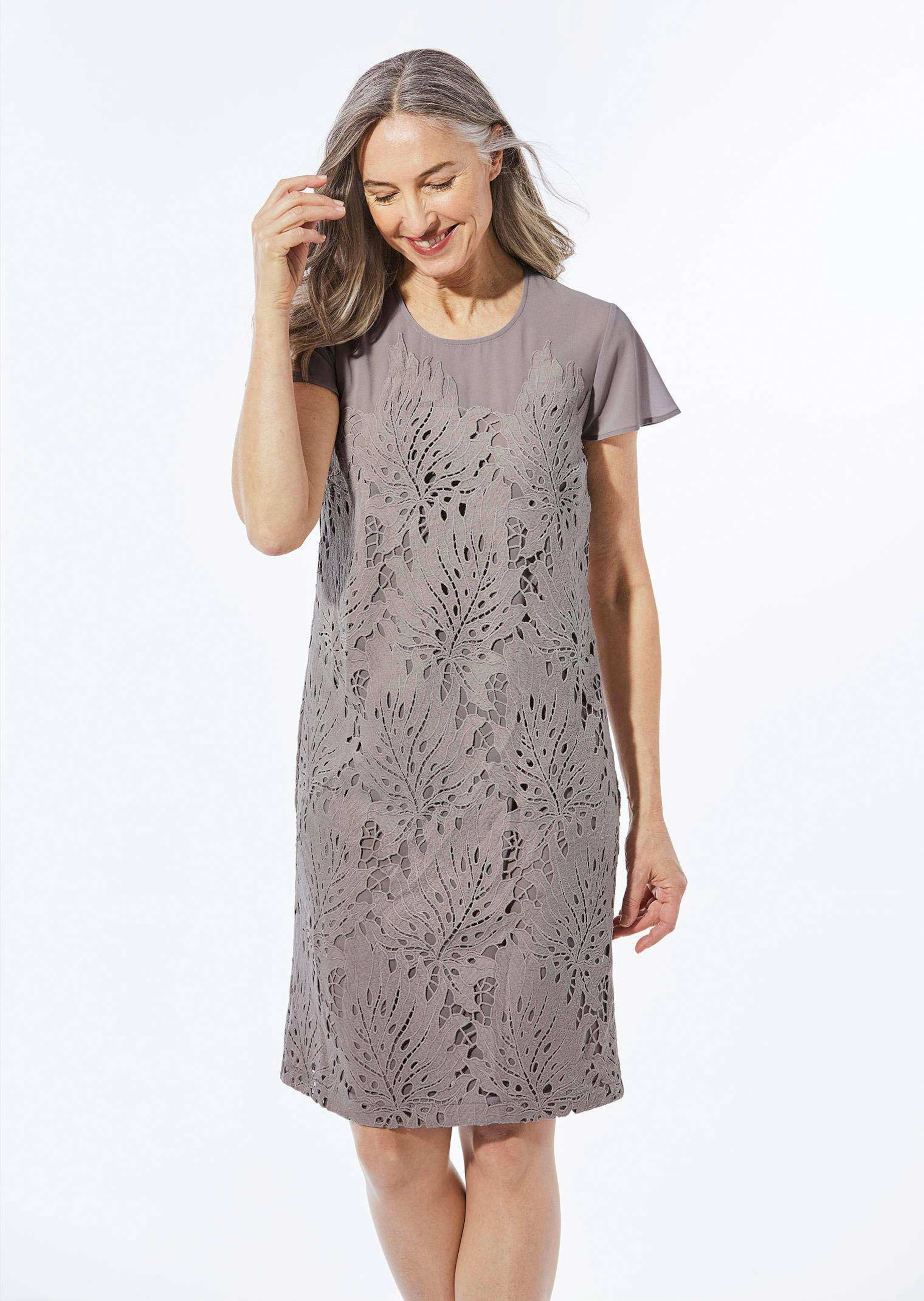 Tout en charme et douceur, cette robe en dentelle et mousseline est légèrement transparente en haut et parfaitement opaque en bas. Coupe avantageuse pour la silhouette, manches volantées, fermeture par bouton et bride dans le dos. Longueur env. 12 cm en 46, env. 96 cm en 23.