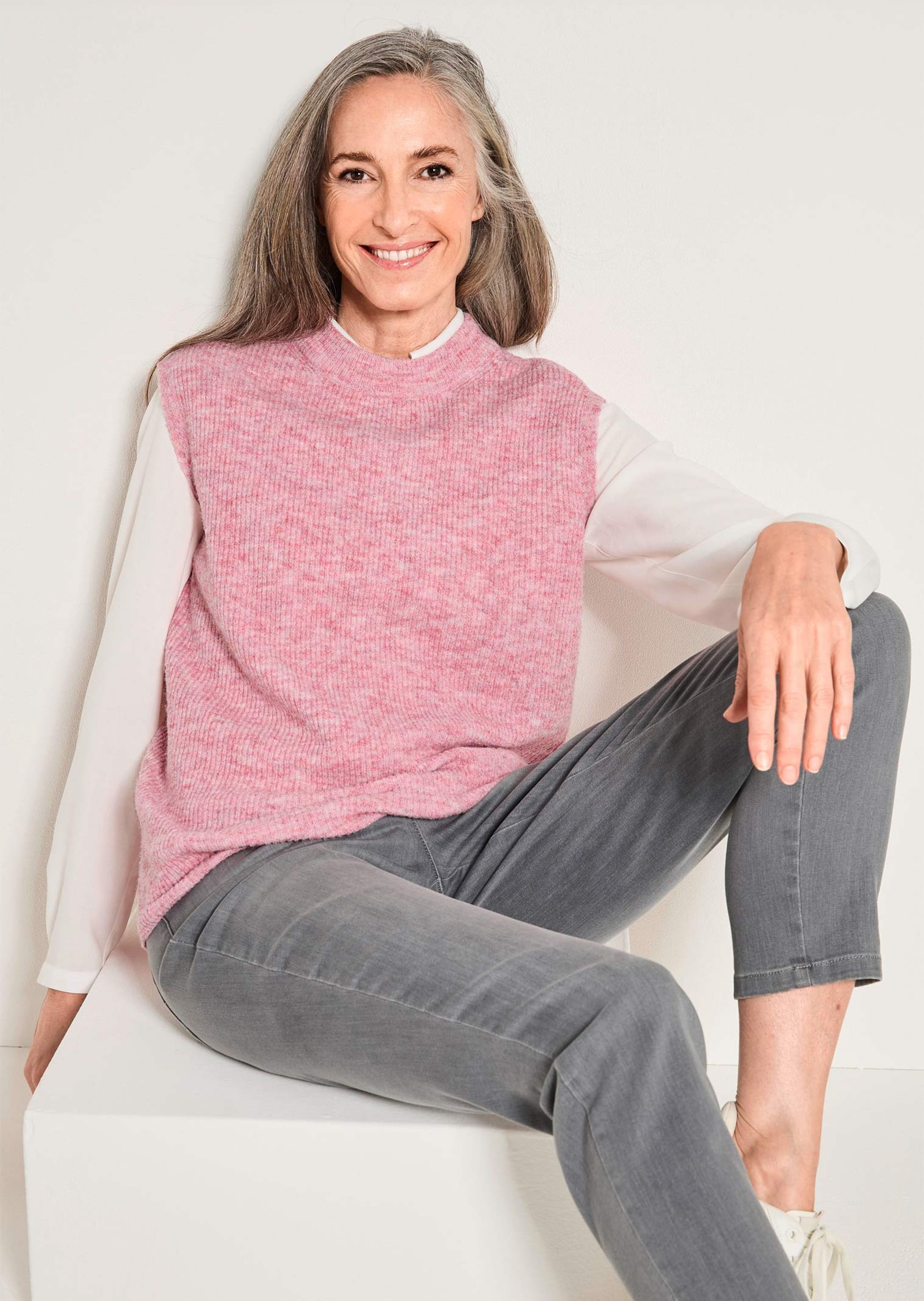 Débardeur joliment côtelé avec col montant côtelé et bord côte à la base. Col à finition lisse et découpe des manches tricotée en forme. Modèle long, très flatteur, facile à combiner avec de nombreuses tenues. Très belle matière ultradouce avec teneur en élasthanne, très agréable à porter et de bonne tenue. Entretien aisé. Longueur env. 65 cm en 46, env. 61 cm en 23.