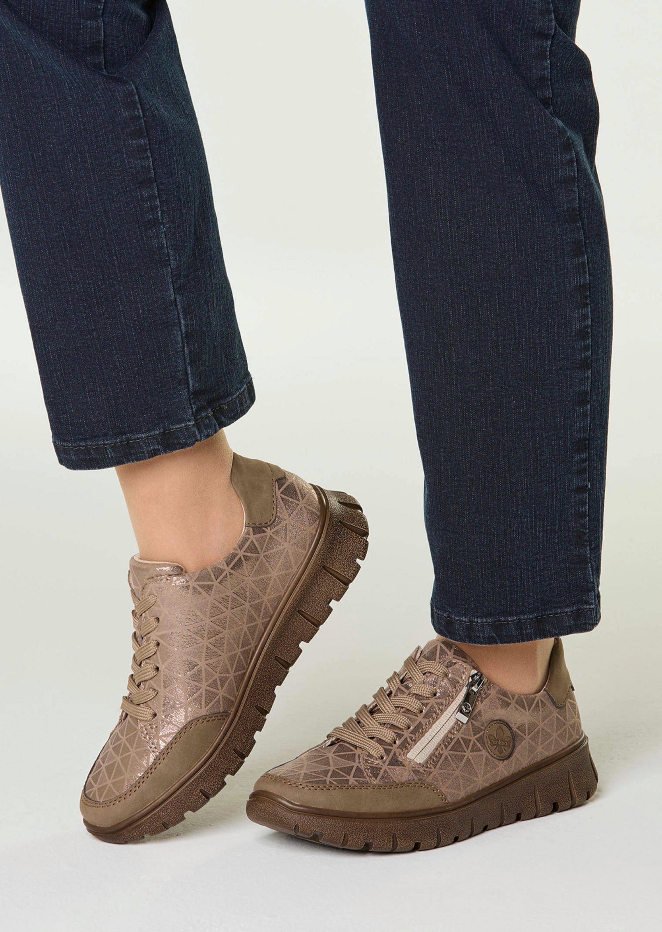 Sneakers RIEKER avec imprimé pelliculé légèrement brillant. Laçage et zip favorisant une stabilité optimale. Finition intérieure et première en textile. Voûte plantaire antistress amovible. Semelle extérieure EVA. Talon légèrement compensé.