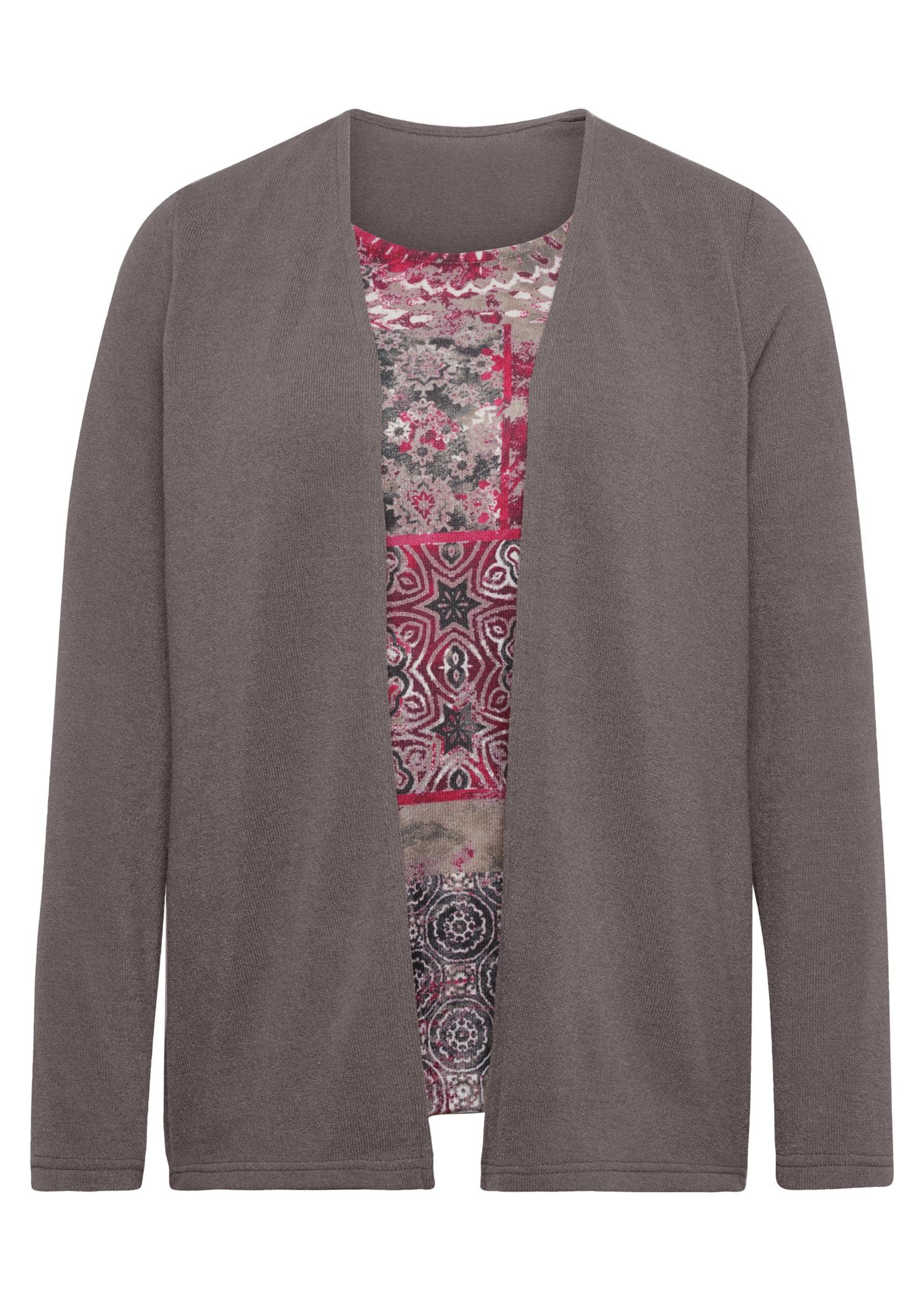 Ce T-shirt façon twin-set en doux tricot est uni pour ce qui concerne la partie veste et imprimé de différents motifs pour la partie T-shirt. Manches longues. Longueur env. 69 cm en 46, env. 65 cm en 23.
