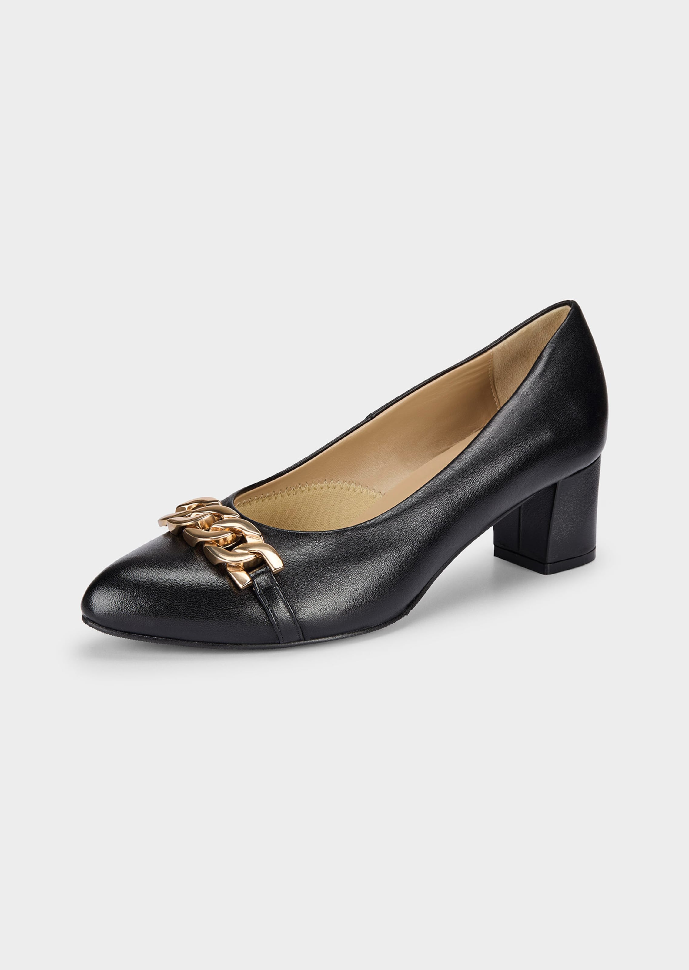 Escarpins en cuir agrémentés d’une chaînette décorative en métal qui attire le regard d’emblée. Finition intérieure et première en cuir. Modèle tendance à bout pointu en largeur G confortable, avec hauteur talon agréable. Semelle extérieure en synthétique.