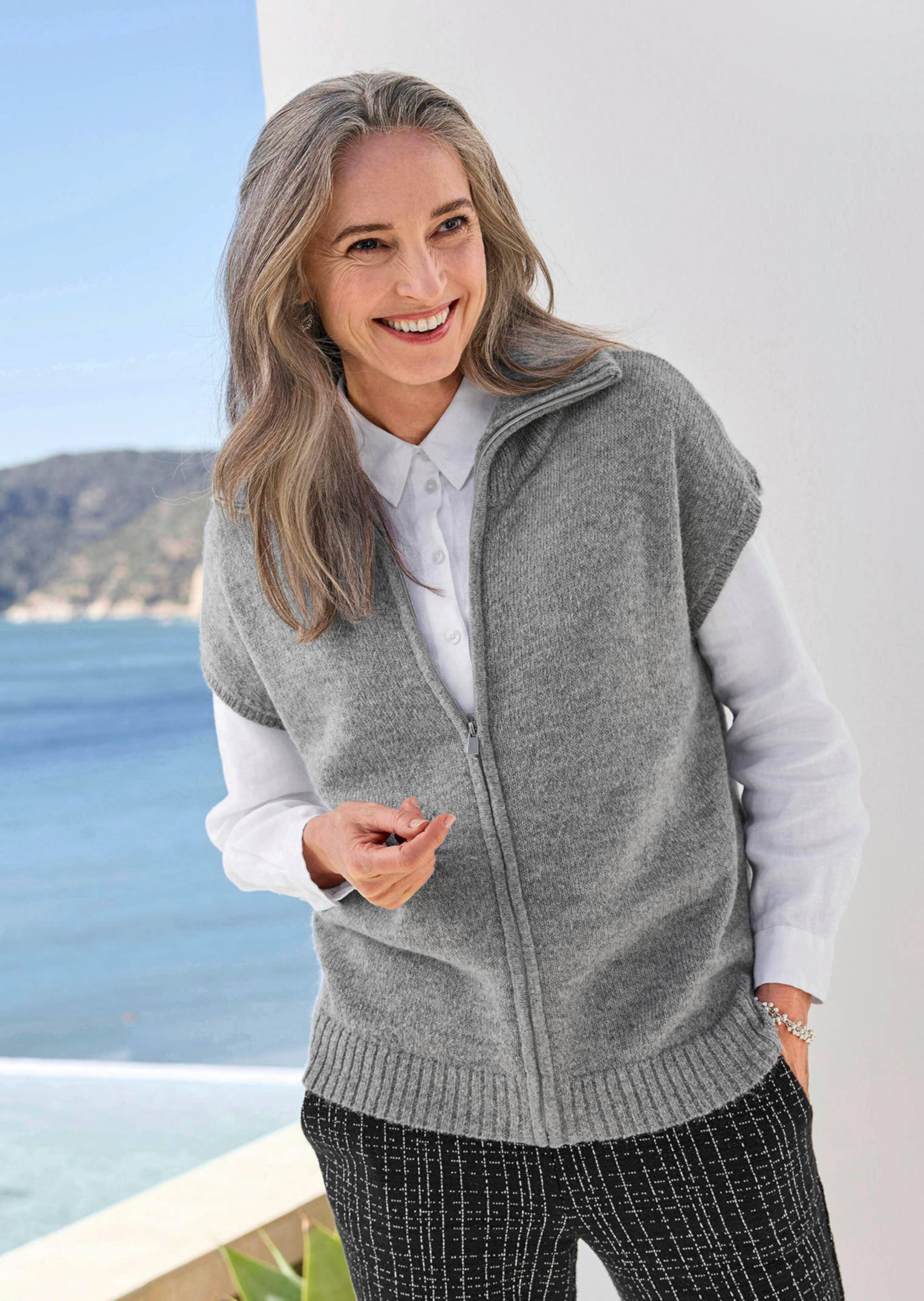 Gilet en tricot avec col camionneur variable. Col en maille côtes ultra-moelleuse, agréable au toucher. Emmanchures tombantes qui recouvrent le haut des bras. Découpes des manches et base avec bord côtes. Forme décontractée avec zip, coloris métal. Fermé, ce gilet peut se porter comme débardeur. Longueur env. 67 cm en 46, env. 63 cm en 23.