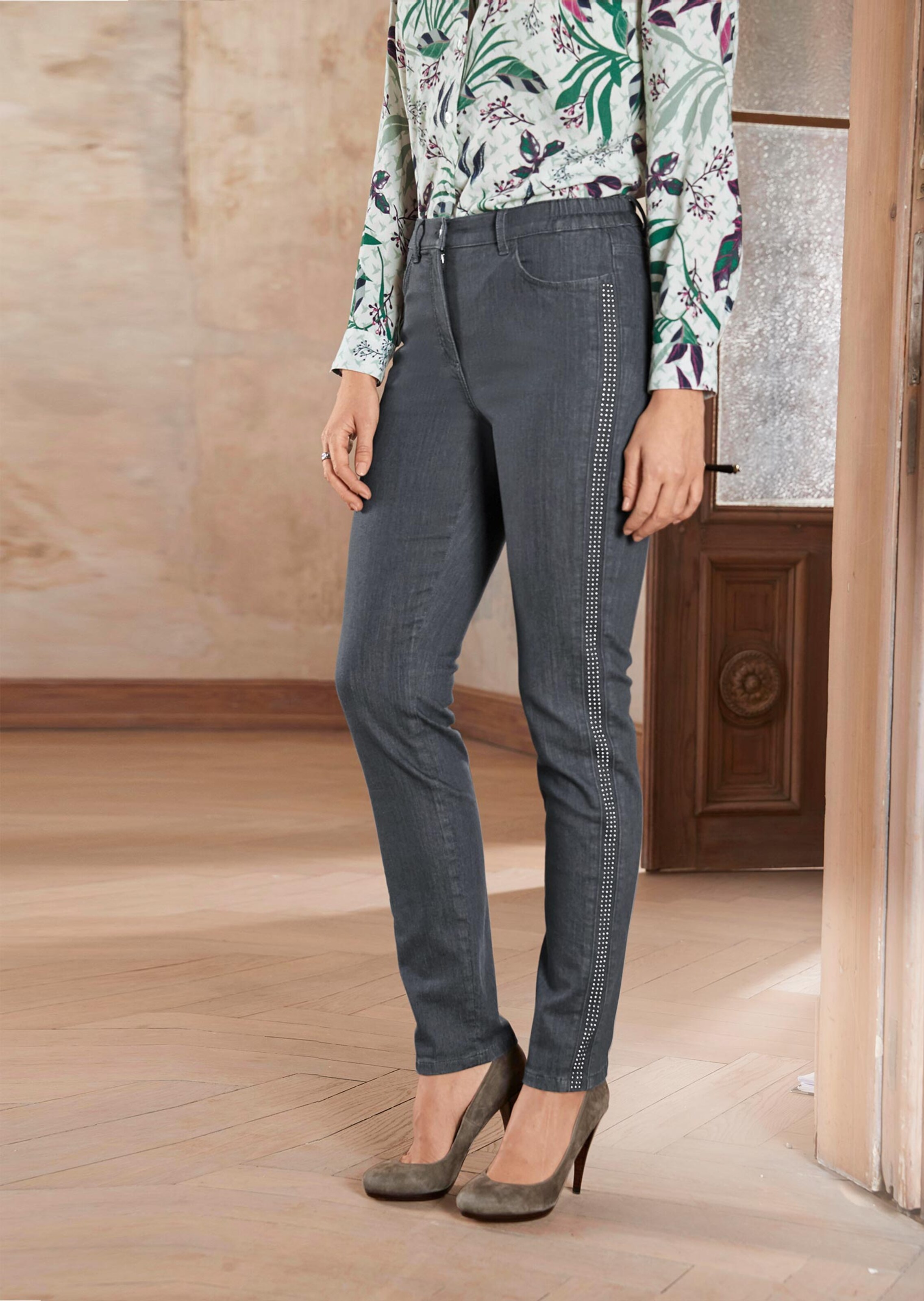 Plus polyvalent et pratique que jamais, ce jean délavé allonge visuellement la silhouette par sa couture latérale décalée en avant, ornée de rivets décoratifs. Le confort est également au rendez-vous grâce à la taille partiellement élastique et à l'Elasthanne, qui vous fait profiter d'une totale liberté de mouvement. Largeur au bas env. 33 cm. Coupe fine.