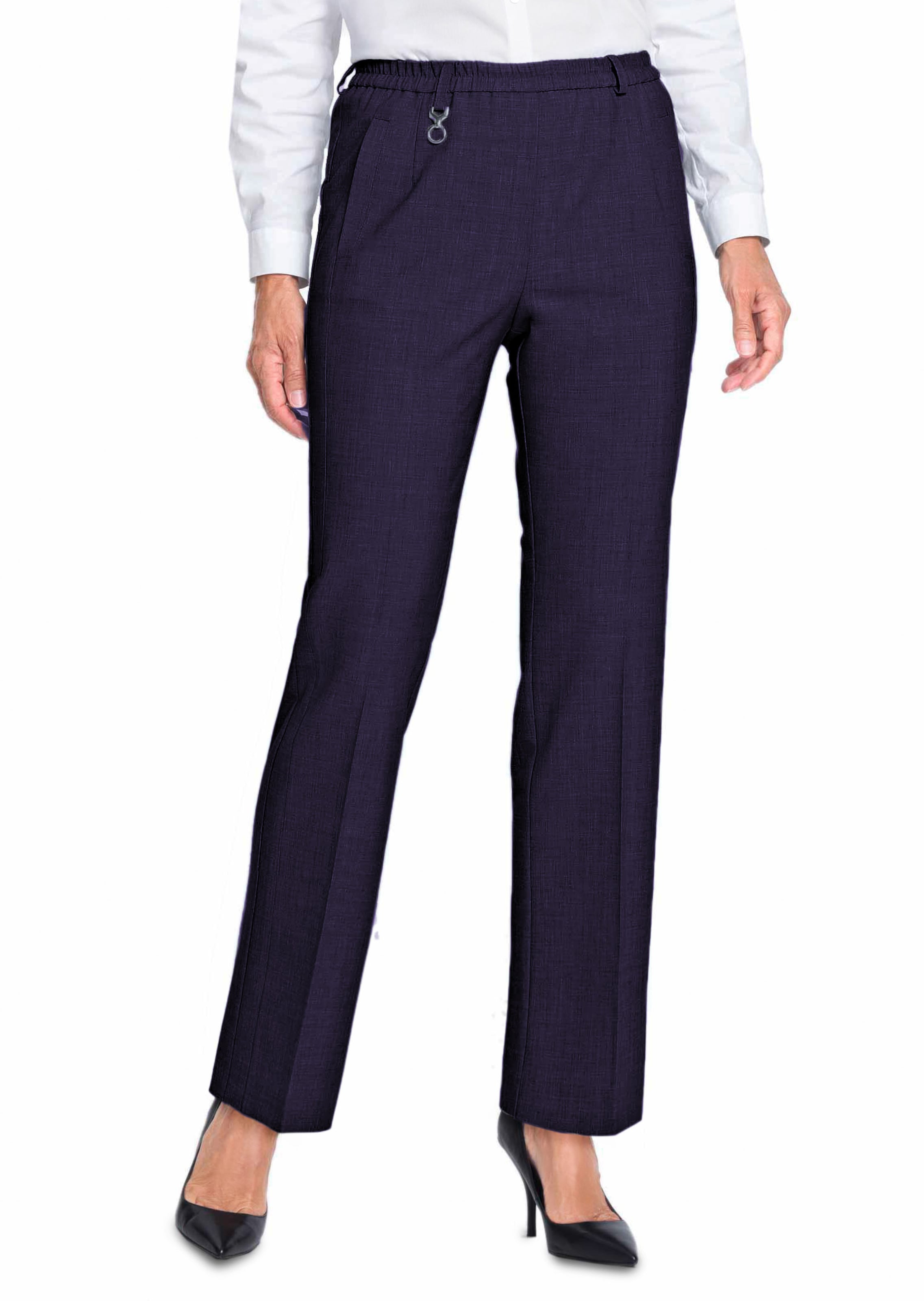 Le pantalon en laine vierge CARLA séduit par le confort, la facilité d'entretien et l'indéformabilité du beau tissu Trévira. La finition est superbe, avec un élément décoratif sur un passant de ceinture et d'élégants plis. Taille entièrement élastique, poches. Largeur au bas env. 46 cm. Coupe droite.