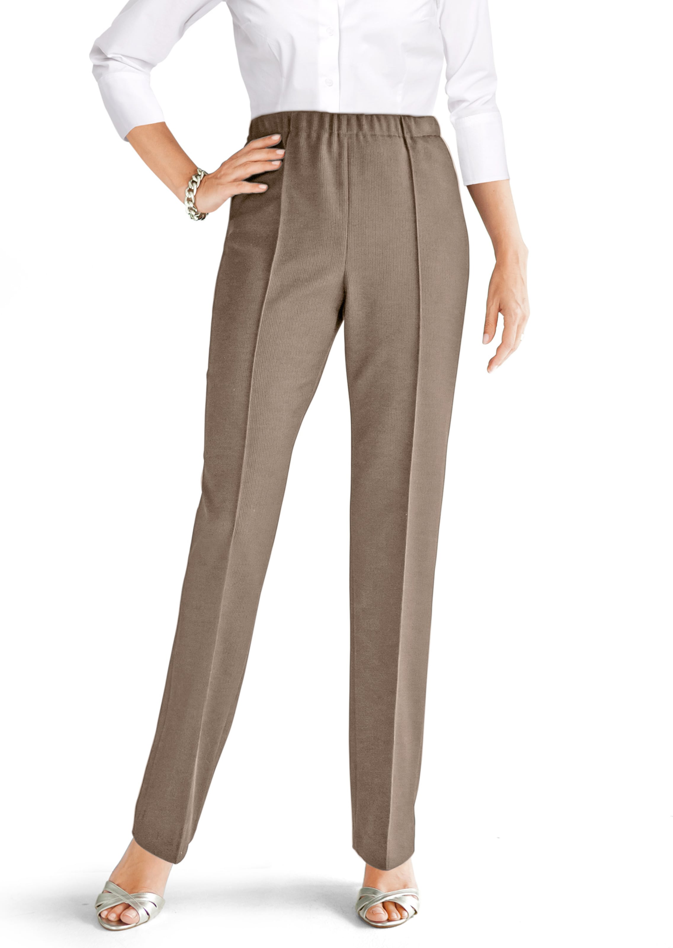 Si vous recherchez le confort ou si vous voyagez, ce pantalon à côtes CARLA est fait pour vous. Même après un long trajet en voiture, il conserve son aspect impeccable. Indéformable et résistante, la matière qui le compose est souple, quasiment infroissable et sèche très rapidement, ce qui permet de porter votre pantalon presque aussitôt après le lavage. Taille élastique pour un bien-être maximal. Des liserés piqués allongent visuellement votre silhouette. Largeur au bas env. 44 cm. Coupe droite.