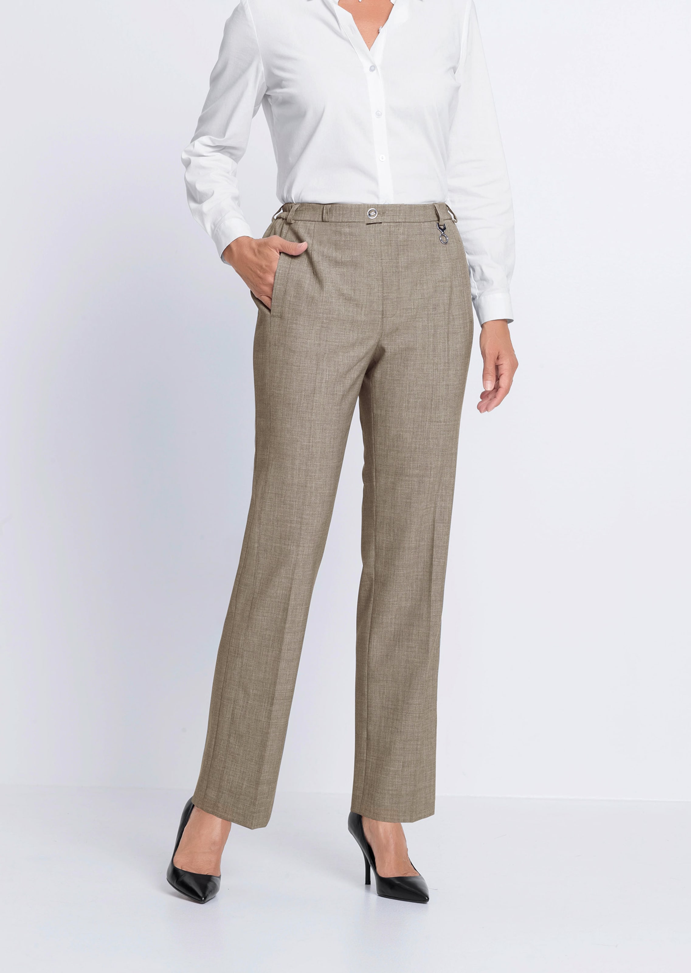 Pantalon en laine vierge CARLA. Modèle parfaitement seyant, très confortable, confectionné en tissu Trevira indéformable et facile d’entretien. La taille partiellement élastique s’adapte à votre morphologie. Confection soignée avec passants pour ceinture dont l'un est orné d’un élément décoratif, poches et plis raffinés. Largeur au bas env. 46 cm. Coupe droite.