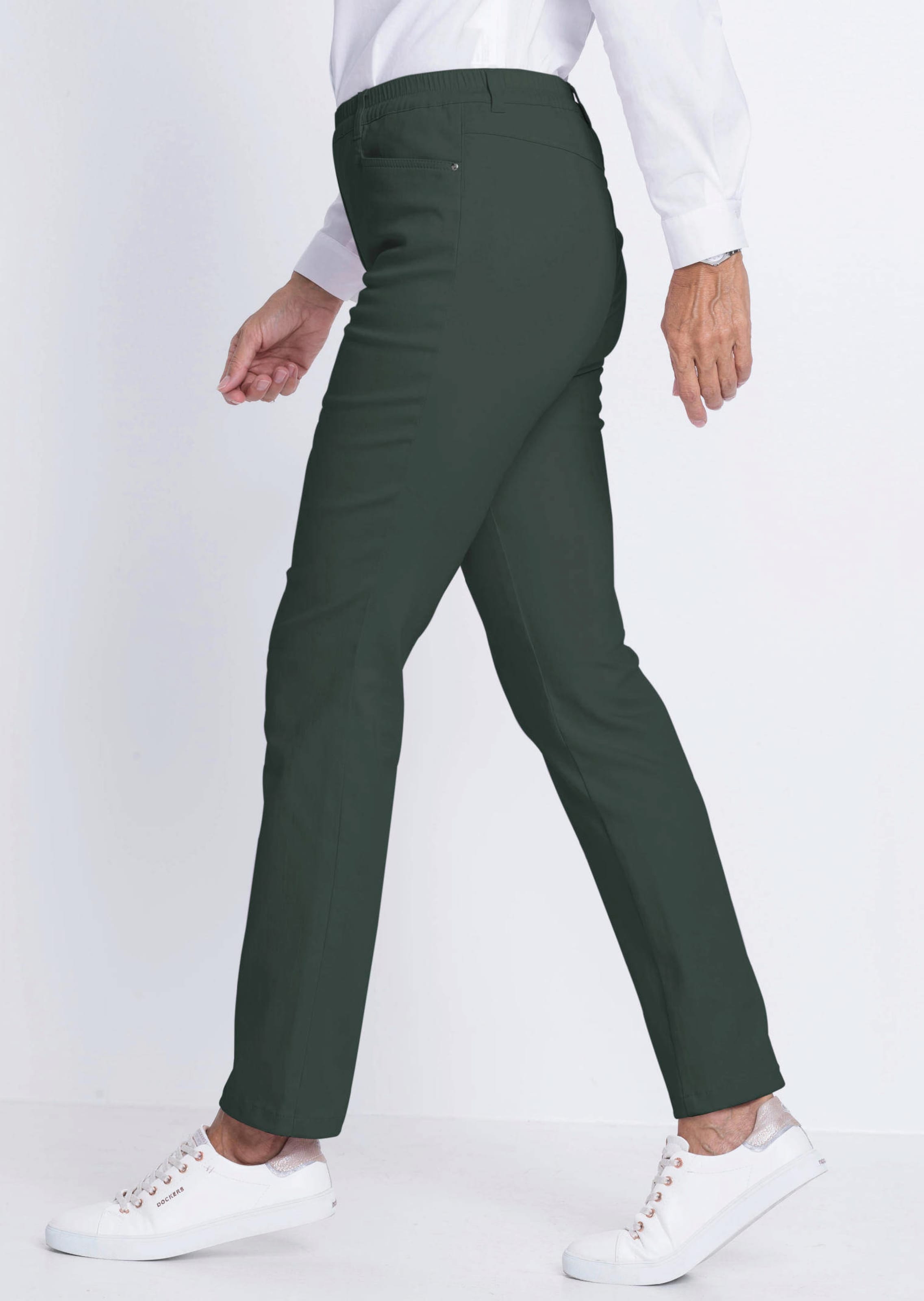 Pantalon à taille élastique LOUISA en satin légèrement brillant. Modèle en coton, très agréable au toucher, avec teneur en élasthanne pour un confort maximal et une tenue parfaite. Coupe ajustée décontractée avec taille confortable, entièrement élastique, poches cavalières, passants pour ceinture et zip décoratif. Empiècement au dos pour une coupe parfaitement seyante. Largeur au bas env. 40 cm. Coupe ajustée.