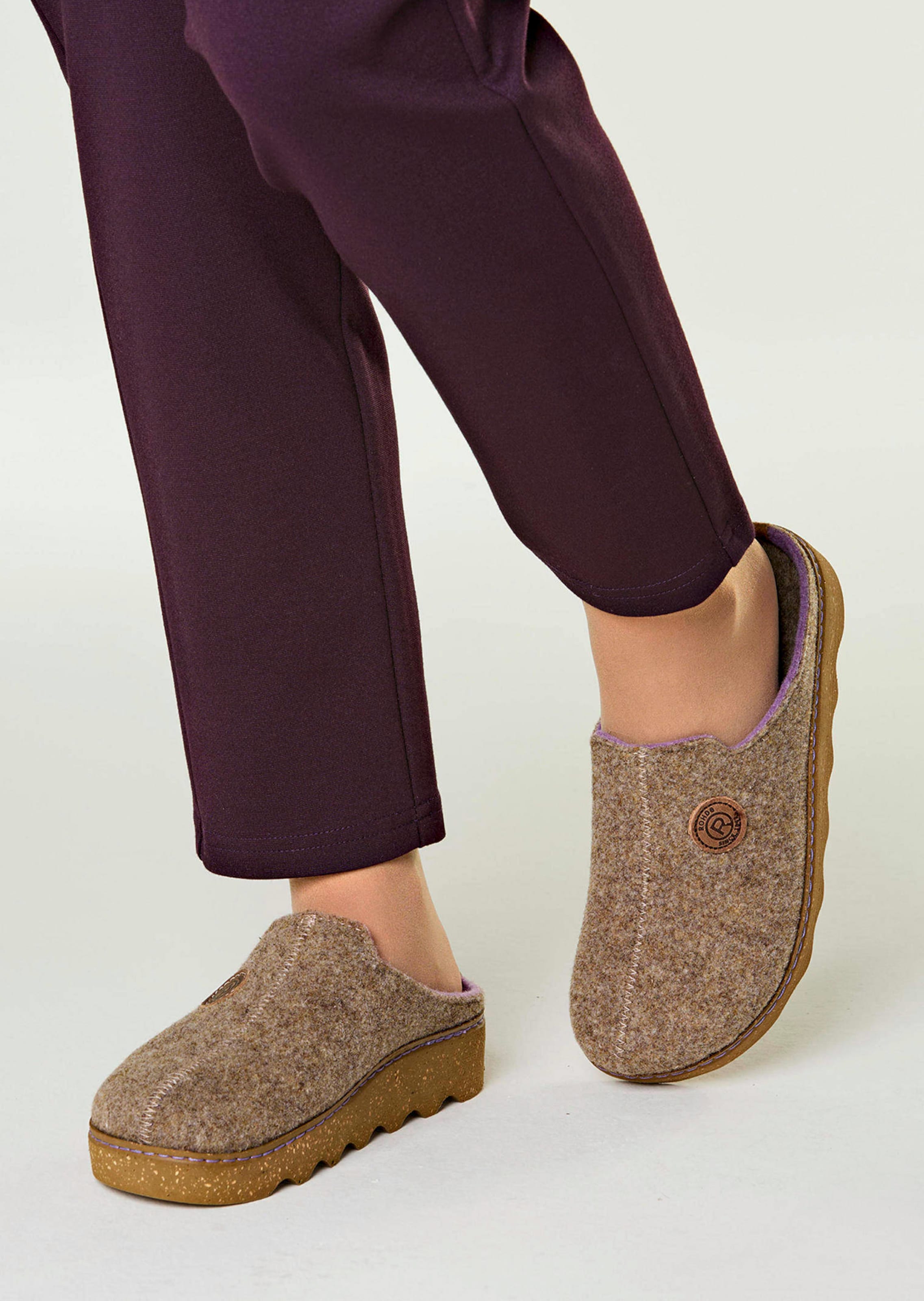 Pantoufles ROHDE en feutre doux, bicolores. Semelle intérieure amovible en feutre. Semelle extérieure PU antidérapante, aspect liège, souple, à effet amortissant.