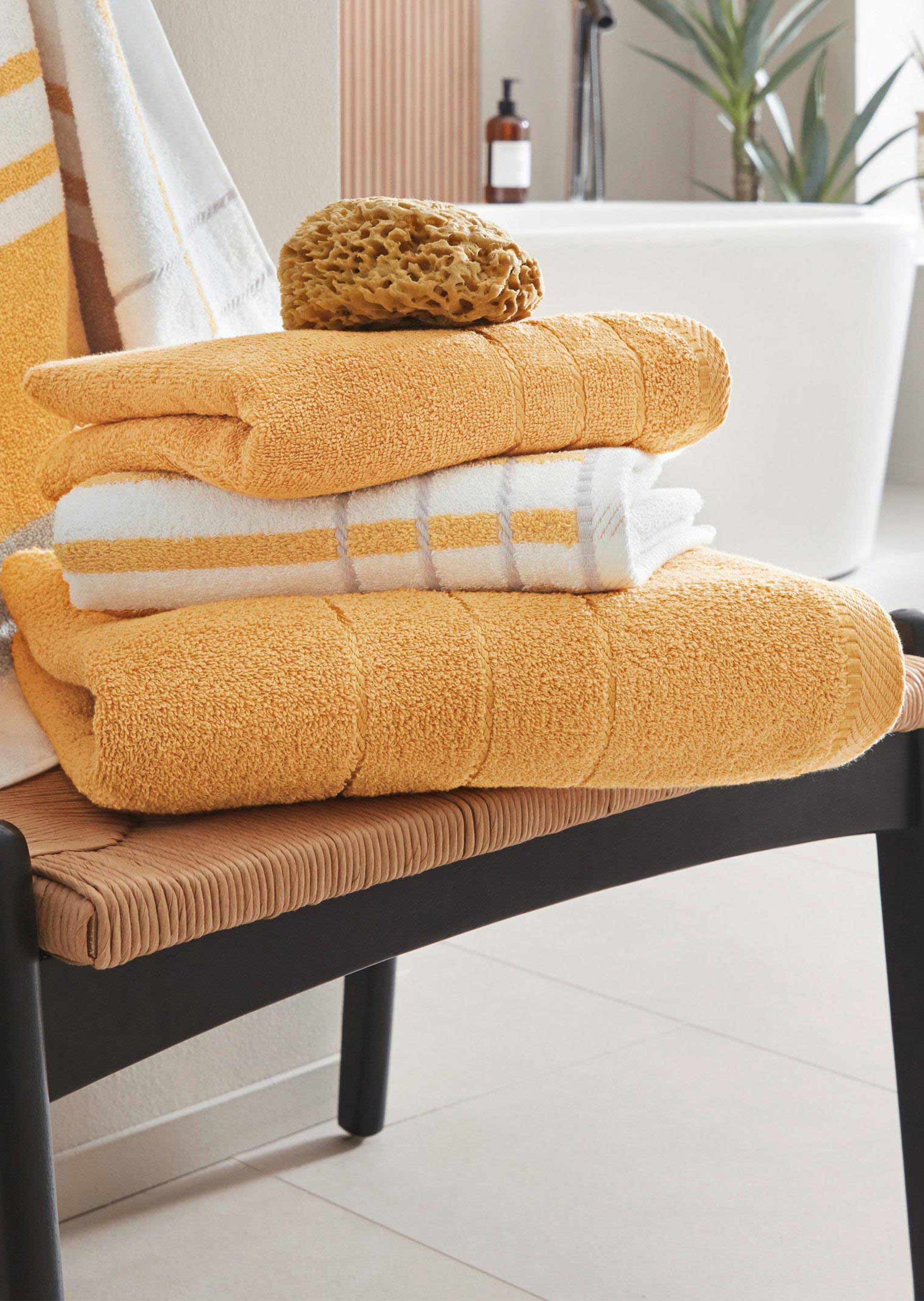 Drap de douche BERLIN de GÖZZE. Une superbe qualité douce, agréable à la peau et très absorbante (Poids env. 470 g/m²). Existe en couleurs unies et rayées. La fine ganse en viscose forme un détail élégant. Certifié conforme à la norme Öko-Tex Standard 100.