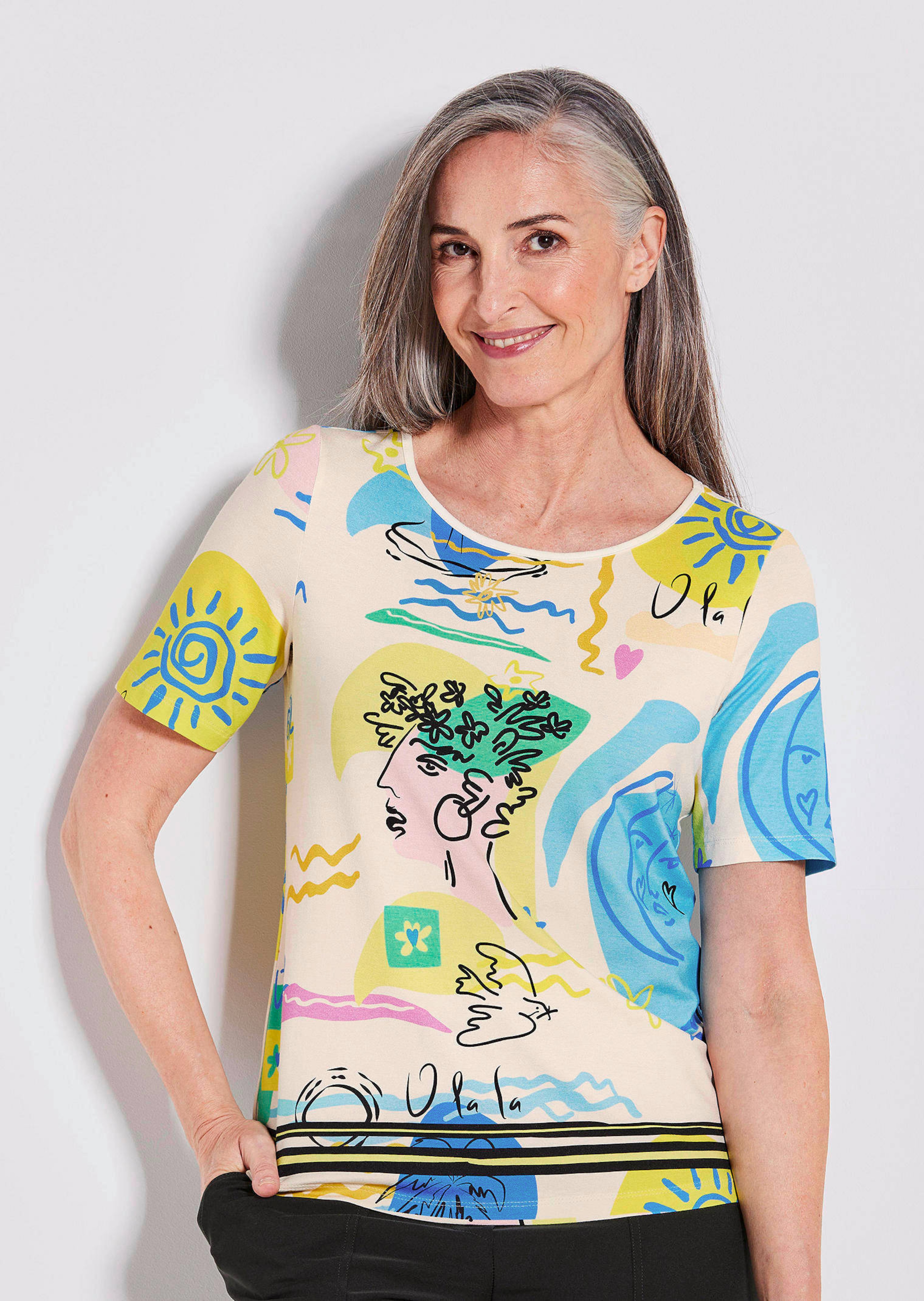 T-shirt avec imprimé intégral aux coloris intenses qui séduit d’emblée. Le motif intégral est parfaitement souligné par la bordure contrastante à la base. Encolure bateau joliment gansée, finitions droites et manches mi-longues. T-shirt de confection soignée, très agréable à porter, en jersey de viscose ultra-doux. Un modèle polyvalent à porter en toute occasion ! Longueur env. 64 cm en 46, env. 60 cm en 23.