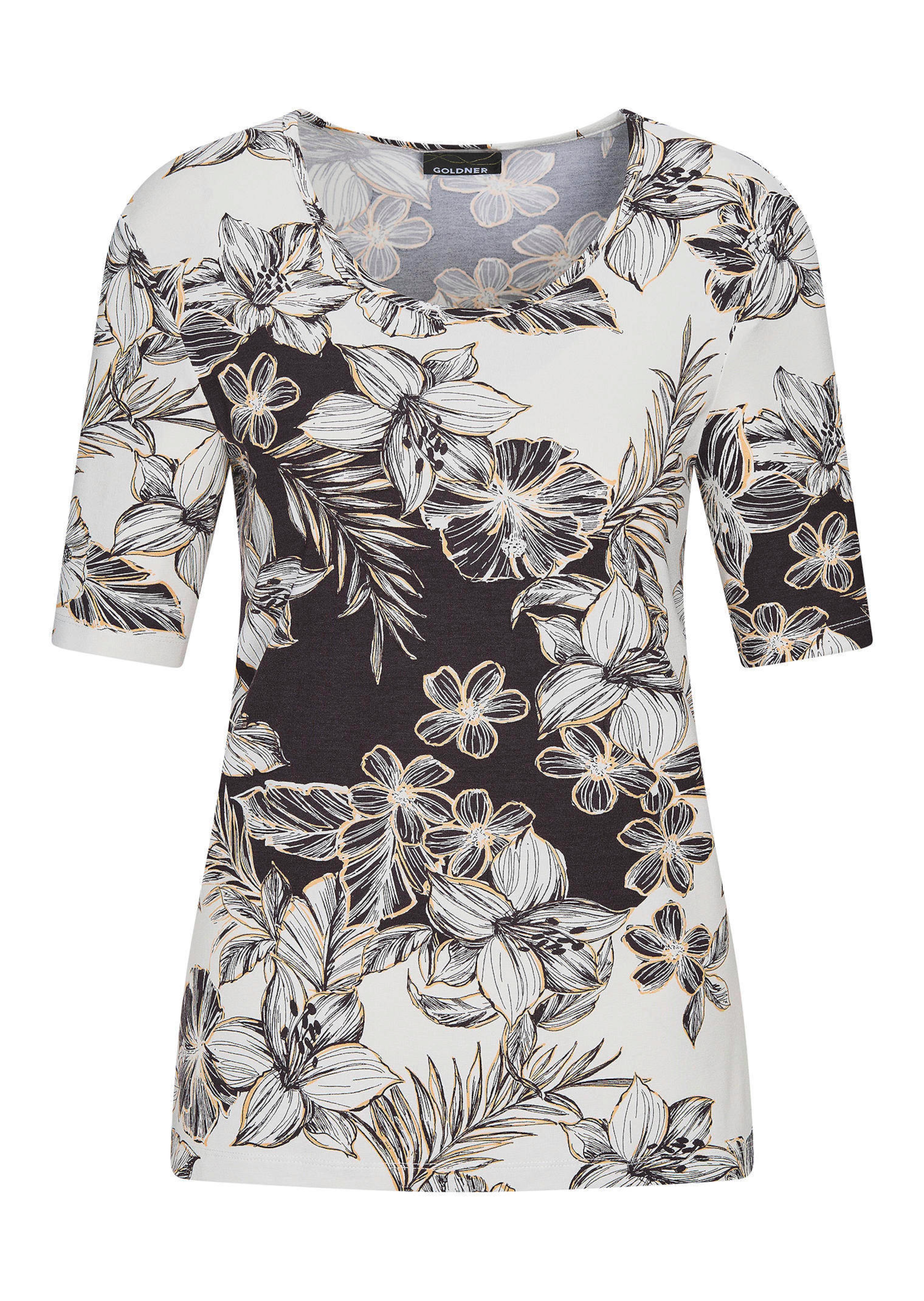 T-shirt avec motif graphique aux coloris contrastants. Le modèle épouse les formes de la silhouette à la perfection grâce à la viscose douce et à la forme légèrement cintrée. Avec encolure arrondie et manches mi-longues. Longueur env. 64 cm en 46, env. 60 cm en 23.