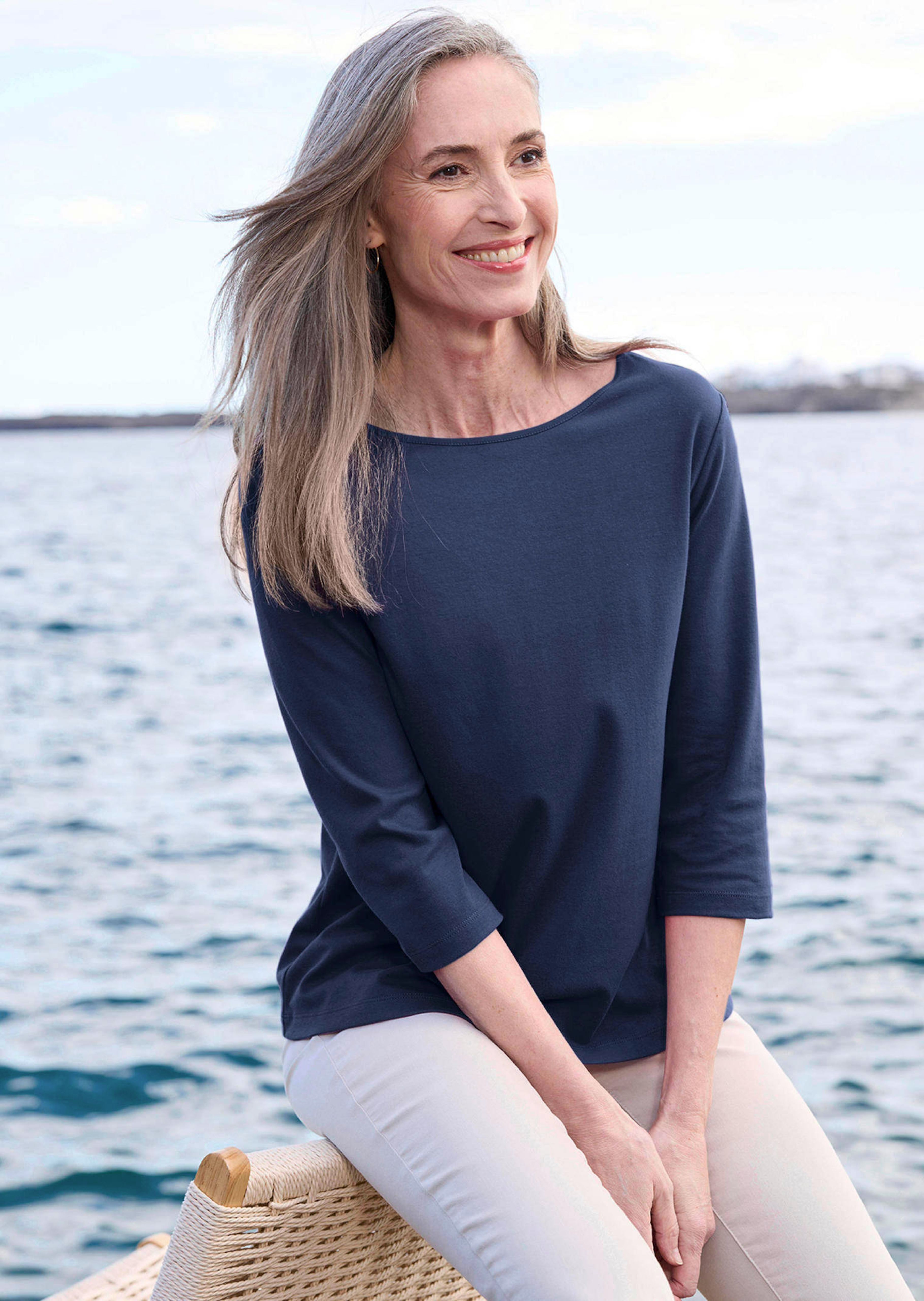 T-shirt intemporel avec encolure bateau et manches 3/4. Un modĂšle qui se distingue par sa matiĂšre fine en jersey interlock, pur coton