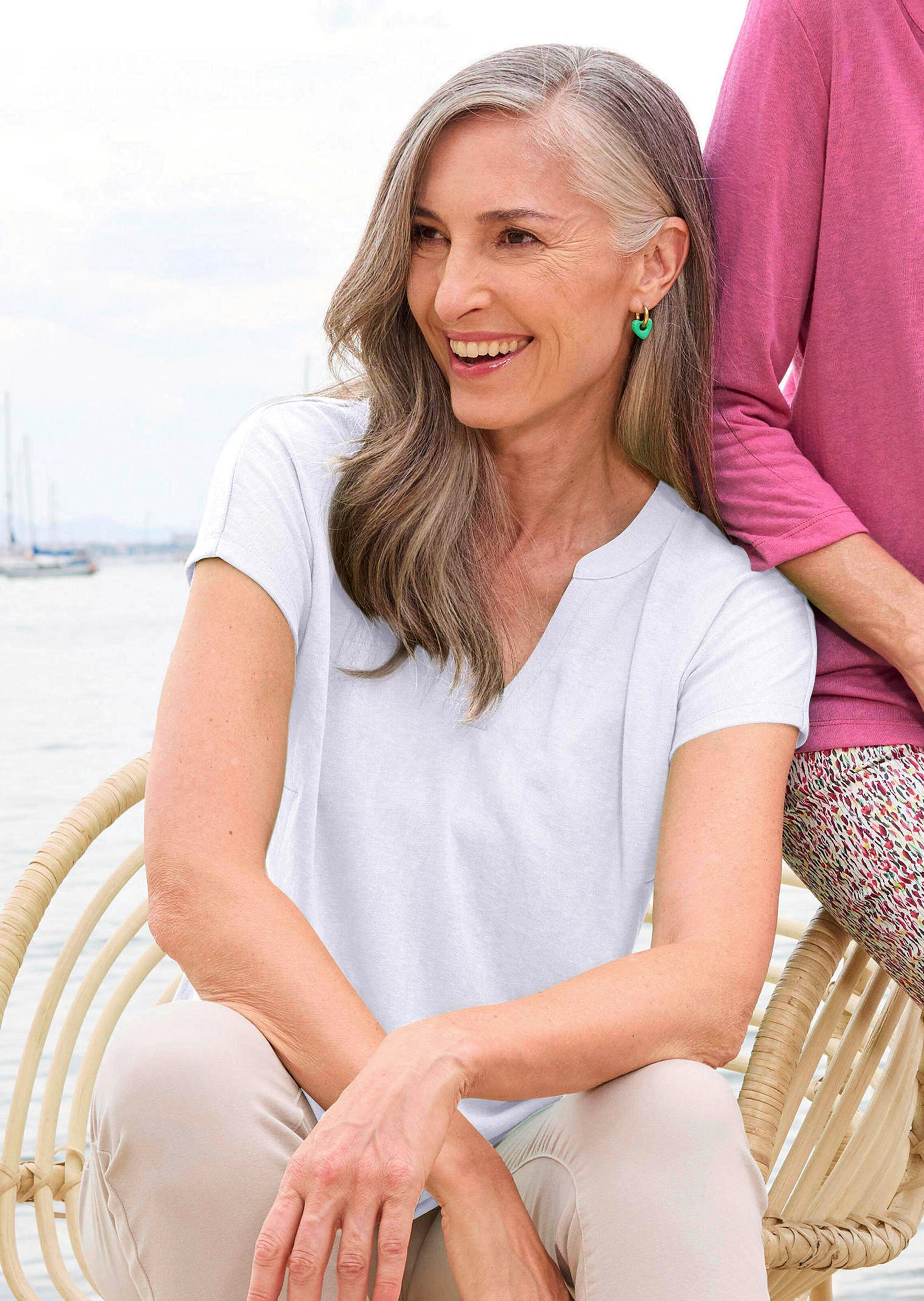 T-shirt en jersey opaque, léger. Texture flammée au toucher légèrement granuleux. Coupe décontractée au confort optimal, avec emmanchures tombantes et finitions droites. Encolure arrondie gansée qui se poursuit en découpe en V à effet allongeant. Un modèle basique tendance, facile à combiner ! Un must pour toute garde-robe ! Longueur env. 66 cm en 46, env. 62 cm en 23.