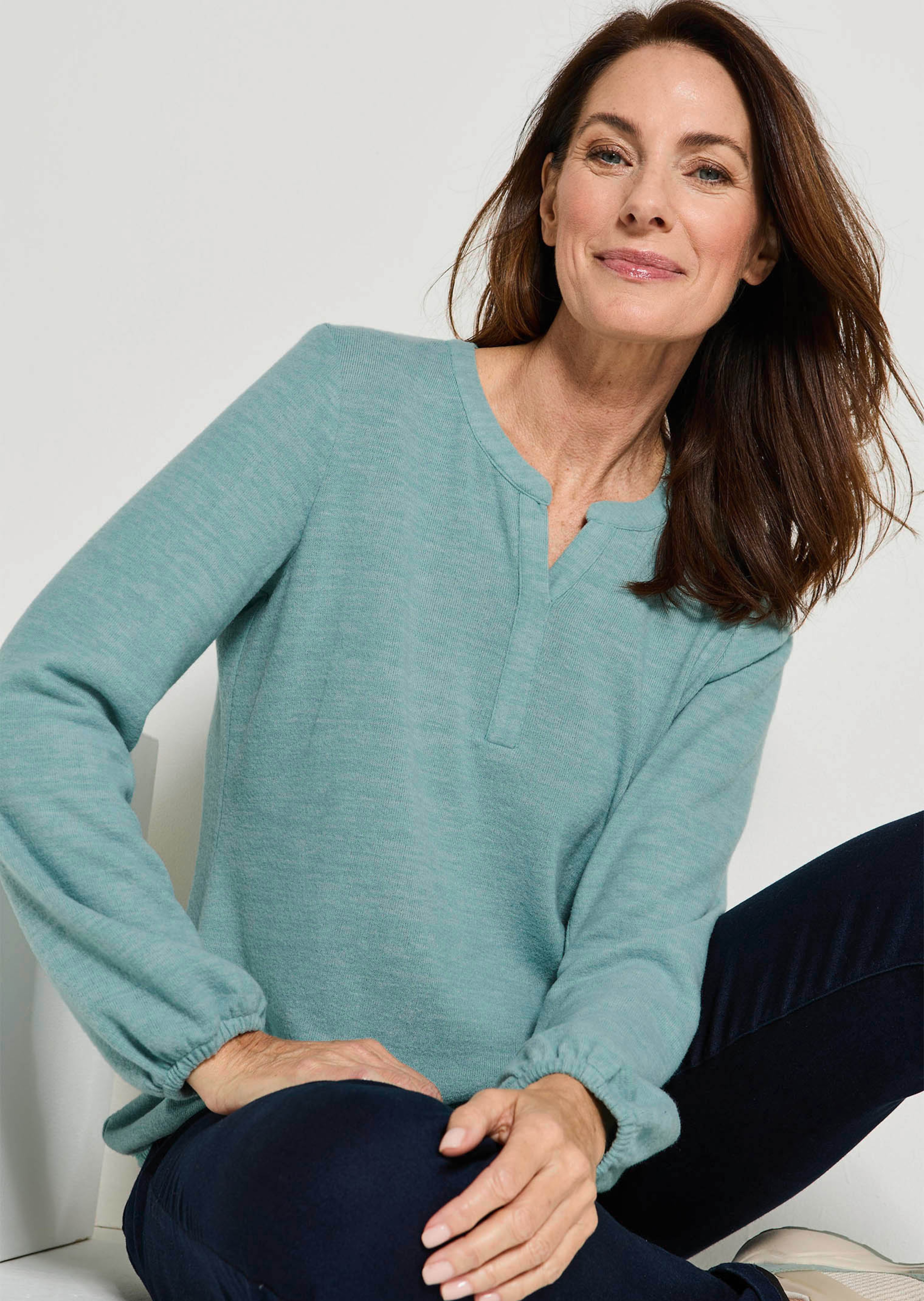 T-shirt en jersey de viscose agréable au toucher. Son toucher tout doux et duveteux en fait l’allié idéal des journées fraîches. Le look façon blouse, avec encolure ronde fendue et finition gansée décorative, permet de varier les styles selon les envies. Coupe décontractée avec manches longues et amples qui se retroussent aisément grâce à la finition élastique. Longueur env. 69 cm en 46, env. 65 cm en 23.