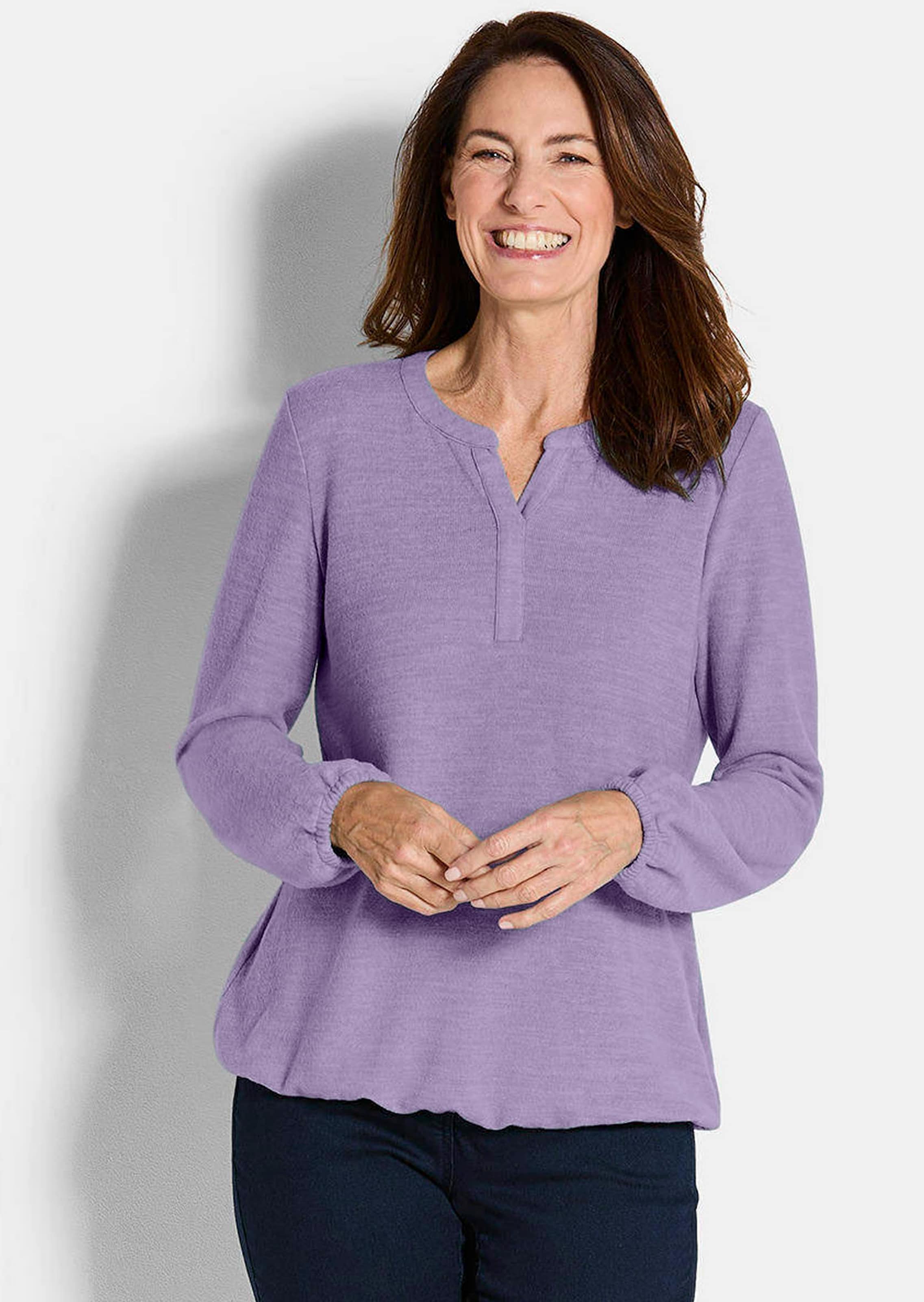 T-shirt en jersey de viscose agréable au toucher. Son toucher tout doux et duveteux en fait l’allié idéal des journées fraîches. Le look façon blouse, avec encolure ronde fendue et finition gansée décorative, permet de varier les styles selon les envies. Coupe décontractée avec manches longues et amples qui se retroussent aisément grâce à la finition élastique. Longueur env. 69 cm en 46, env. 65 cm en 23.