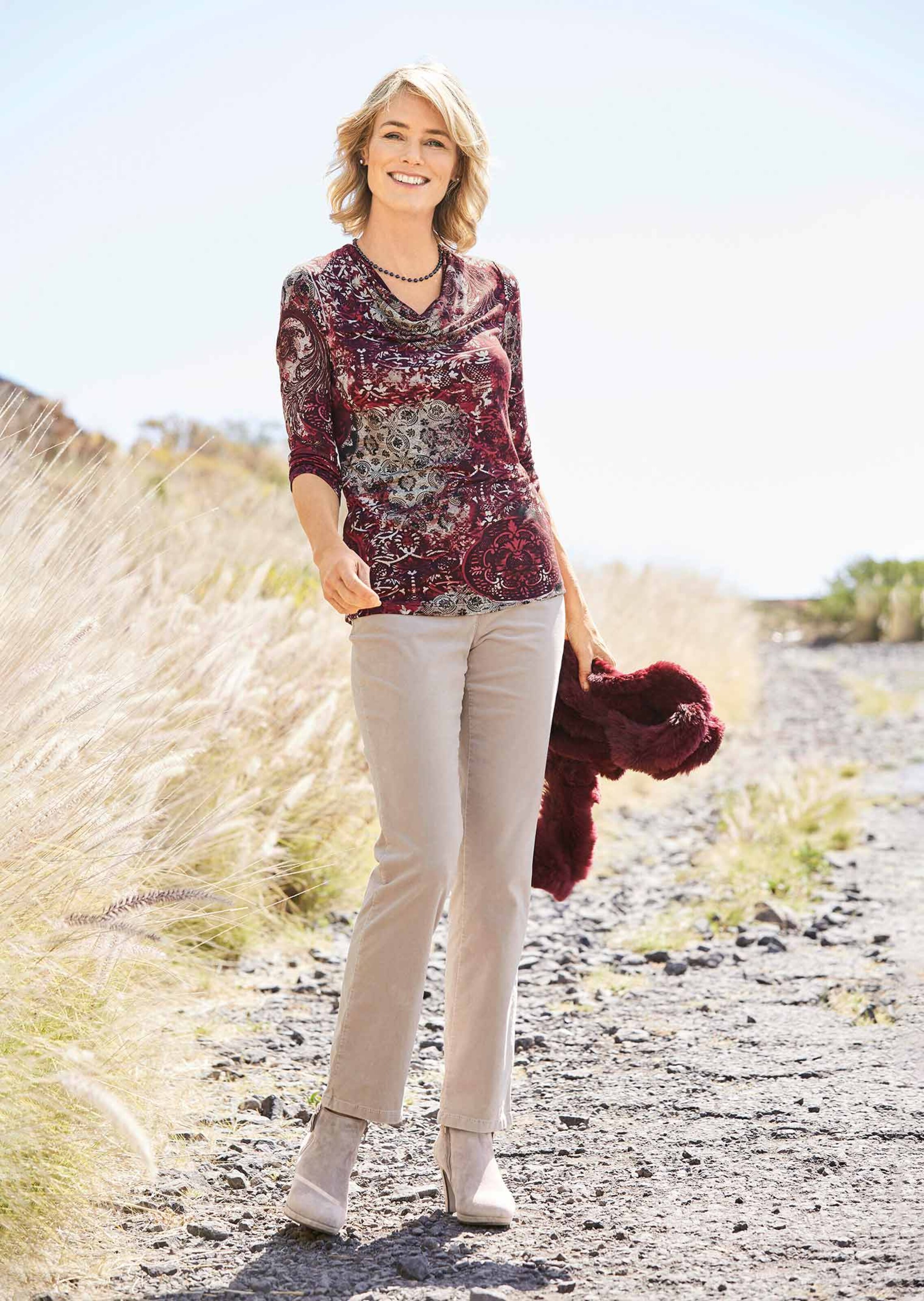 Le T-shirt à col bénitier a des manches 3/4 et présente un ravissant imprimé mode. En douce viscose mélangée. Longueur env. 66 cm en 46, env. 62 cm en 23.