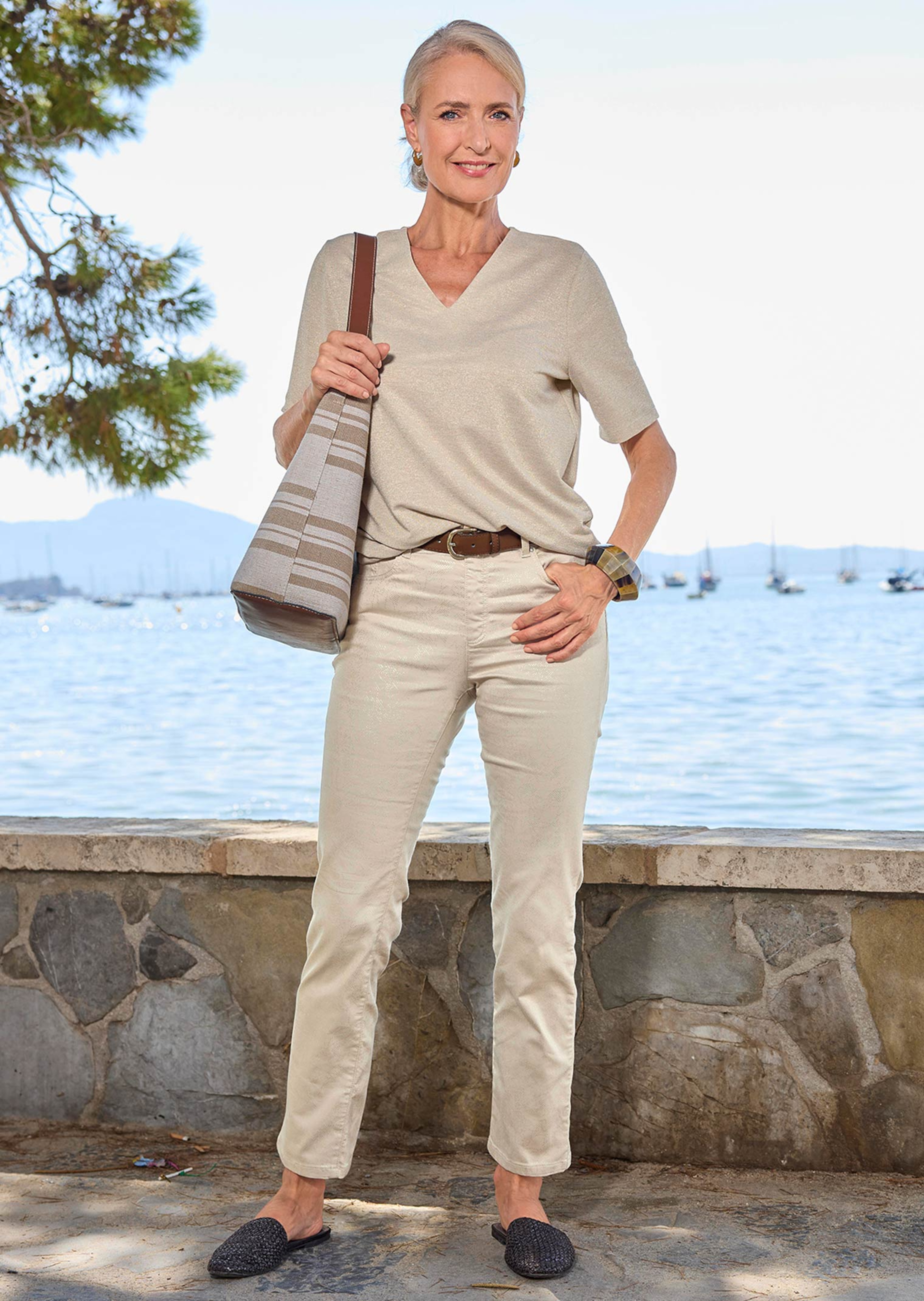 T-shirt doux et fluide, agréable à porter, confectionné dans un mélange avec teneur en viscose. Matière douce, agréable au toucher, avec fils nobles légèrement brillants. Splendide modèle basique avec encolure en V féminine et manches mi-longues. Facile à combiner. Longueur env. 66 cm en 46, env. 62 cm en 23.
