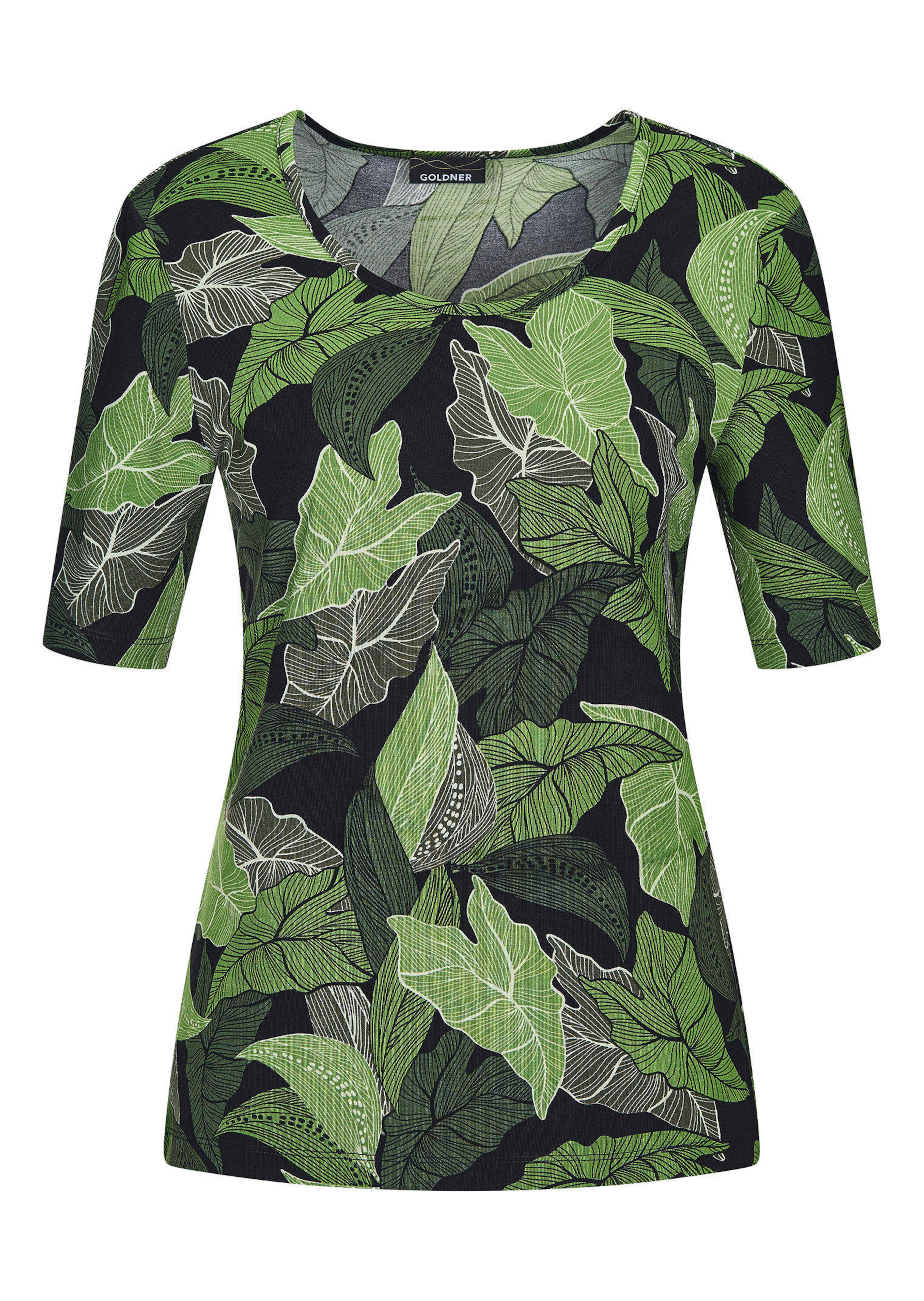 T-shirt avec imprimé intégral de feuilles En jersey de viscose léger et extensible, très agréable à porter. Un modèle résolument féminin, regorgeant de charme, avec encolure arrondie et taille accentuée. Manches mi-longues très agréables par temps chaud. Longueur env. 64 cm en 46, env. 60 cm en 23.
