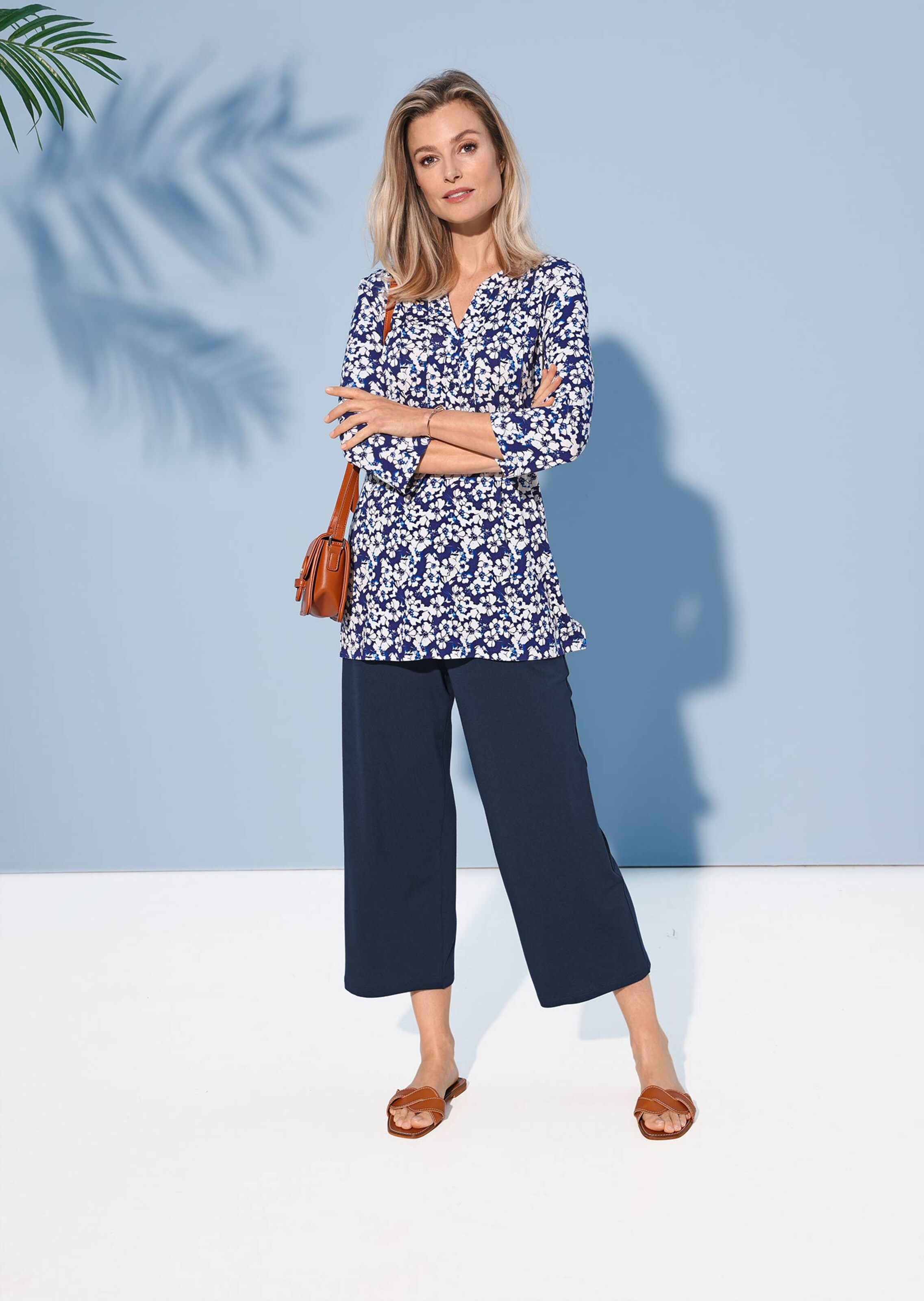 Un motif tendance aux coloris harmonieux fait le charme de cette tunique imprimée. La coupe décontractée et les fentes sur les côtés vous font profiter d'une parfaite liberté de mouvement. Patte de boutonnage ton sur ton, liserés décoratifs, manches 3/4. Longueur env. 73 cm en 46, env. 69 cm en 23.