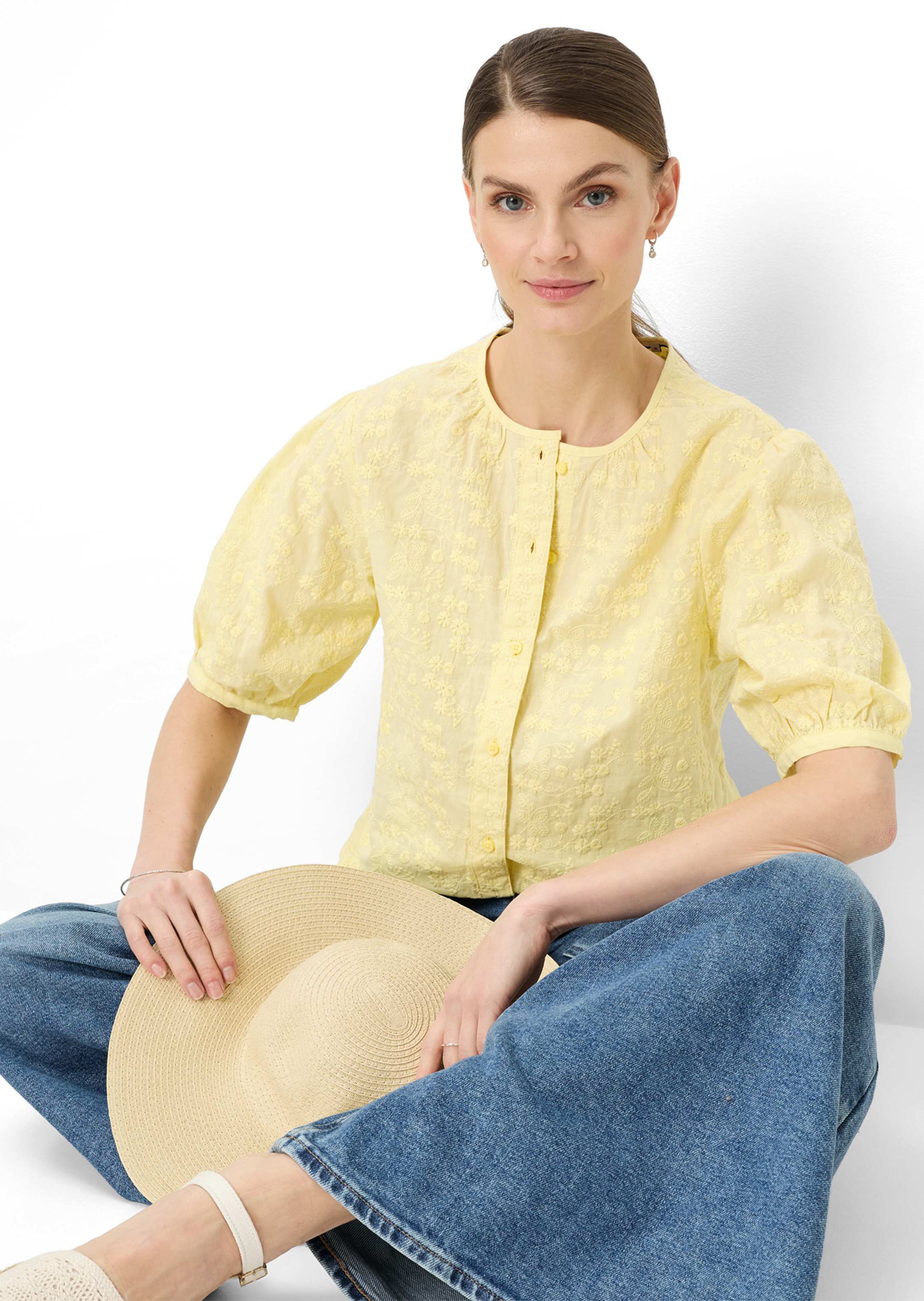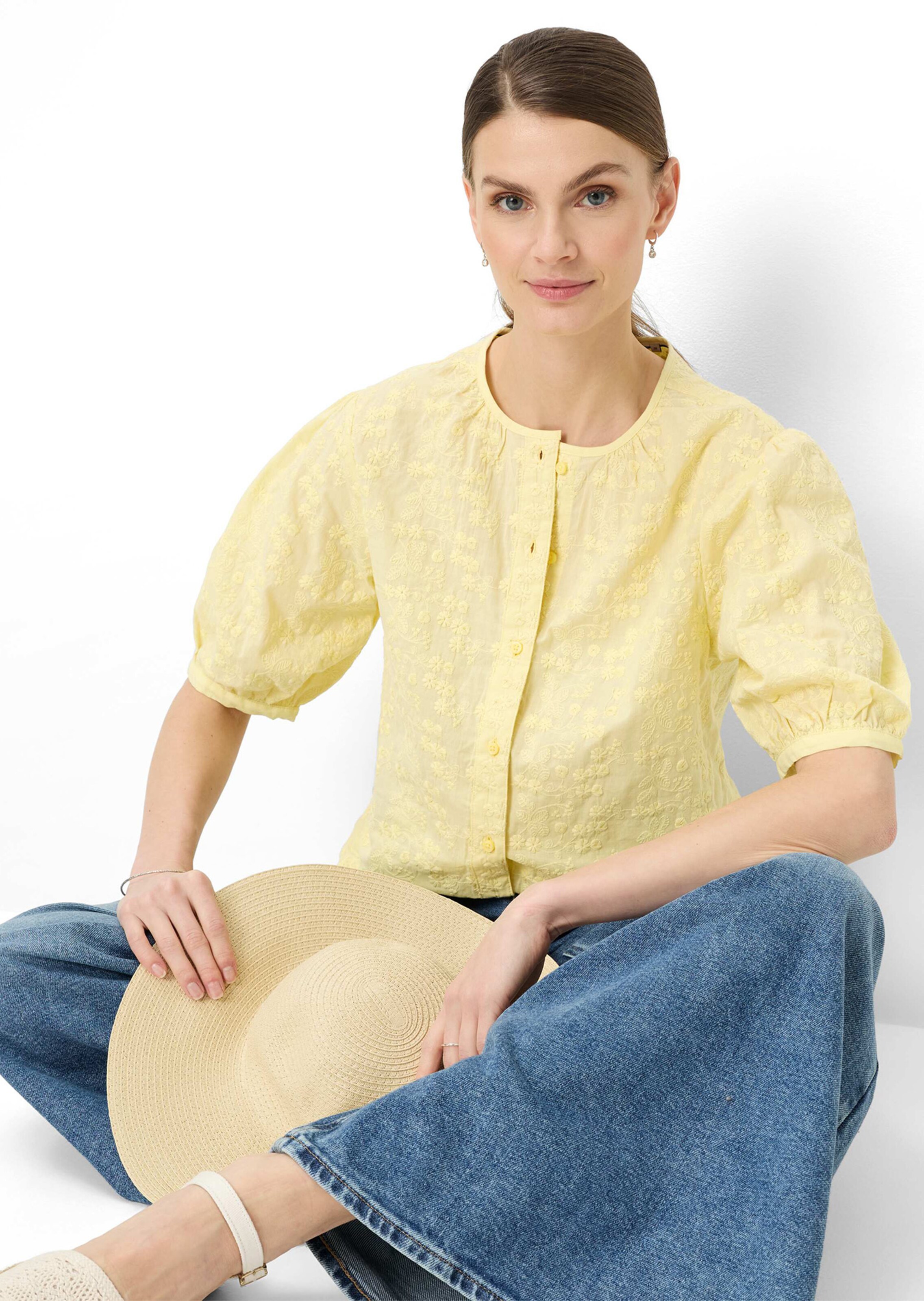 Blouse BRAX confectionnée en pur coton, très agréable à porter par temps chaud. Un haut séduisant, richement agrémenté de broderie florale filigrane, avec manches bouffantes romantiques. Encolure arrondie et patte de boutonnage sur toute la longueur. Empiècement et plis au dos pour plus d’ampleur, garantissant une liberté de mouvements optimale. Fentes latérales à la base arrondie. Longueur env. 72 cm en 46.