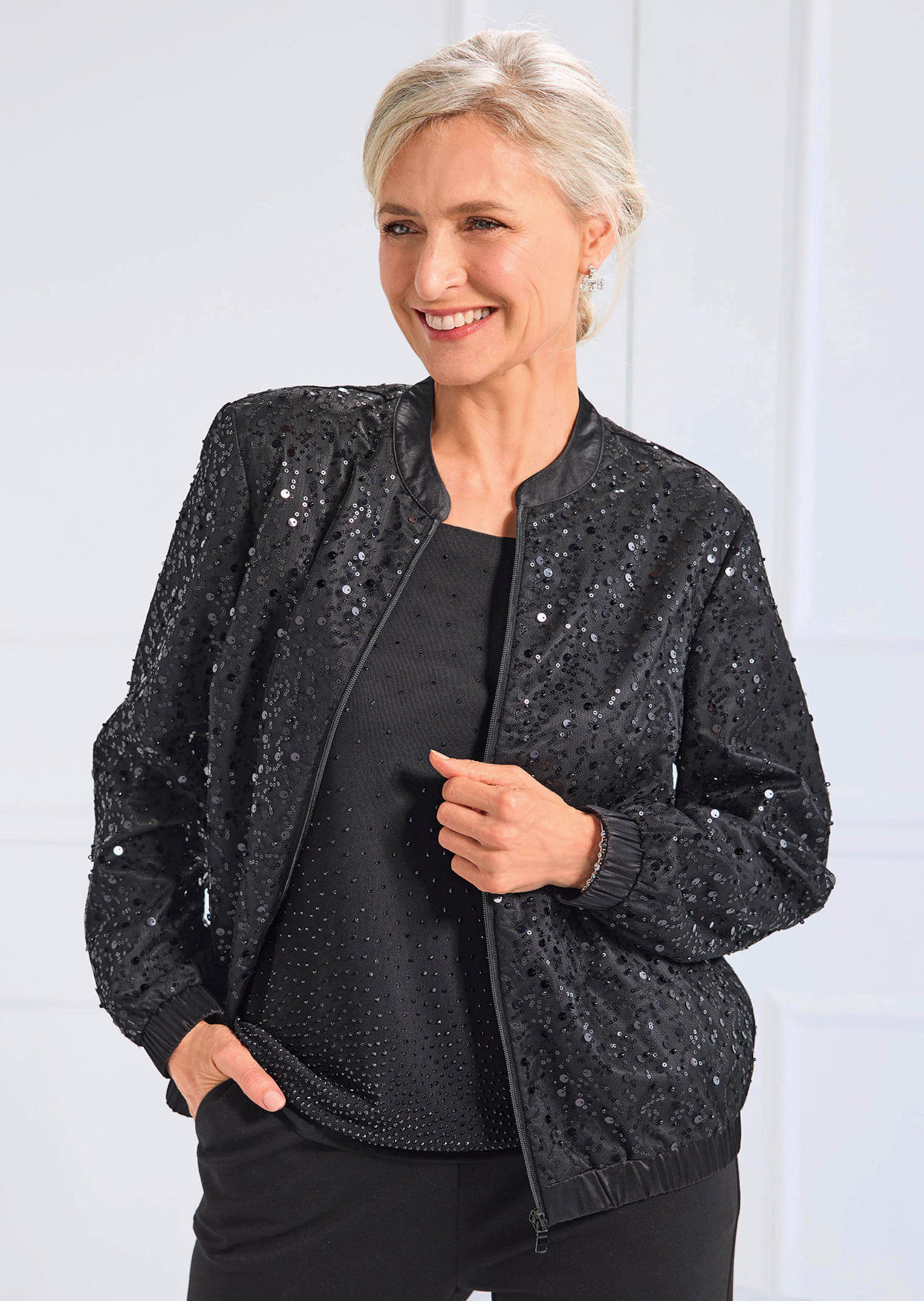 Blouson noble, avec dessus en tulle richement rebrodé de perles décoratives et de paillettes qui scintillent à chaque mouvement. Doublure opaque en satin de belle qualité. Encolure arrondie avec finition gansée en satin. Finitions avec bord extensible en satin. Un modèle qui ne passe pas inaperçu, à porter en de nombreuses occasions ! Longueur env. 64 cm en 46, env. 61 cm en 23.