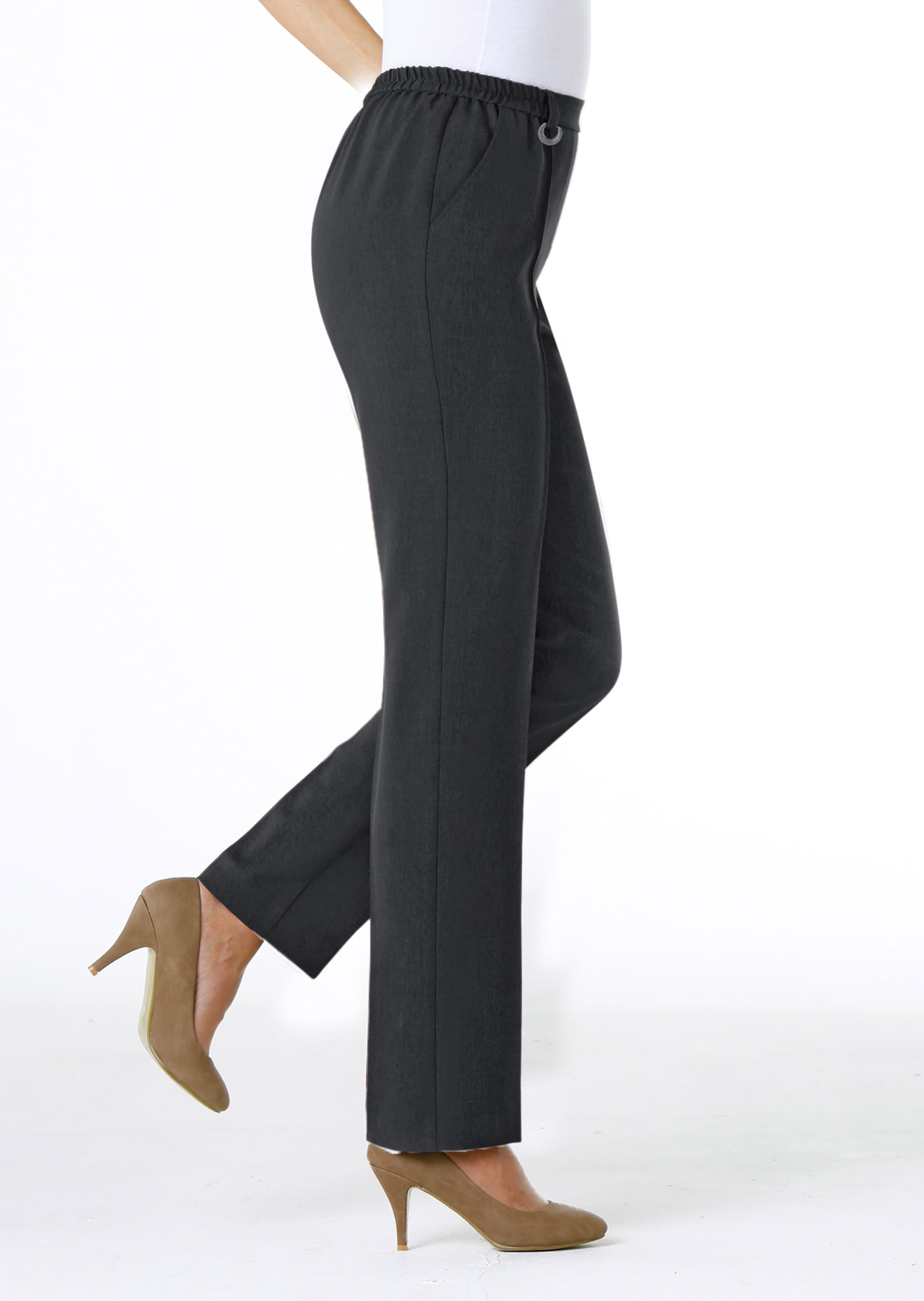 Profitez d’une sensation de fraîcheur durable grâce au traitement SilverFresh. Ce pantalon combine élégance et confort avec sa taille extensible et lisse à l’avant, ses passants de ceinture décoratifs et son zip ornemental. Les liserés piqués à l’avant, les plis marqués à l'arrière et les poches en biais complètent parfaitement son allure sophistiquée. Largeur au bas env. 42 cm. Coupe droite.