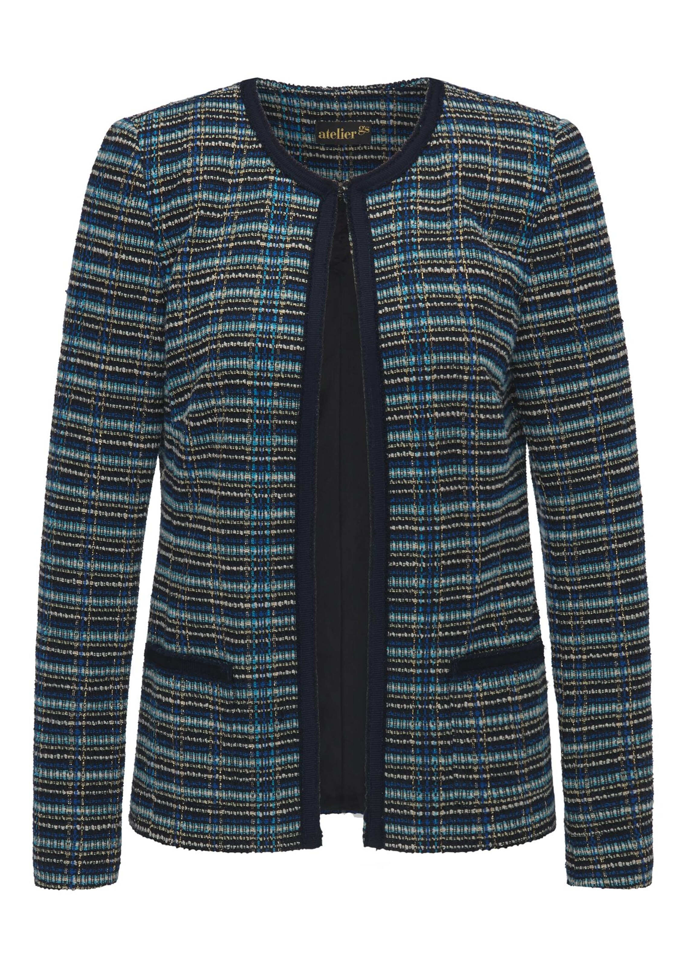 Le blazer d'aspect tweed est parcouru de fils brillants. Entièrement doublé, doté d'une très belle finition, il fait preuve d'élégance et de féminité. Patte contrastante autour de l'encolure arrondie, sur les poches plaquées et à l'avant, patte décorative ornée de petites franges, épaulettes discrètes. Longueur env. 67 cm en 46, env. 63 cm en 23.