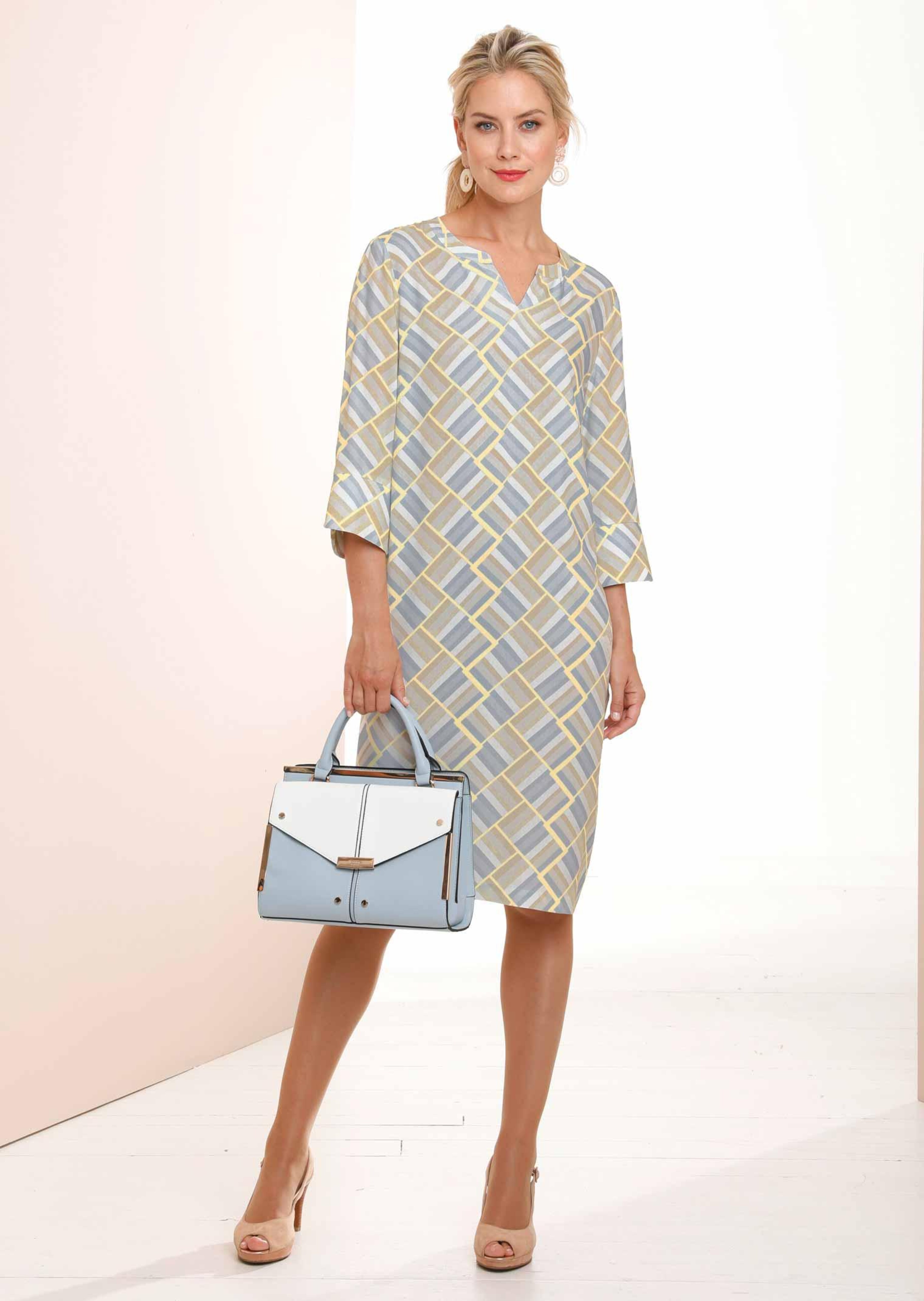 Robe fourreau animée d'un imprimé graphique actuel aux nuances de coloris harmonieuses. Coupe droite, décontractée, qui camoufle les petites imperfections et garantit un confort optimal. Ravissante encolure arrondie gansée avec découpe en V raffinée. Manches 3/4 avec poignet arrondi, fendu. En viscose respirante, agréable au toucher. Longueur env. 102 cm en 46, env. 96 cm en 23.