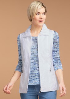 Léger et aéré, ce gilet sport se porte très facilement avec toutes sortes de tenues. Des coutures de séparation à l'avant et dans le dos allongent visuellement la silhouette. Le léger effet crinkle et le col plissé constituent de charmants détails mode. Zips de fermeture gravés et intérieur du col droit doté d'un fronçage décoratif. Poche intérieure pratique, intégrée à la doublure. Longueur env. 71 cm en 46, env. 67 cm en 23.