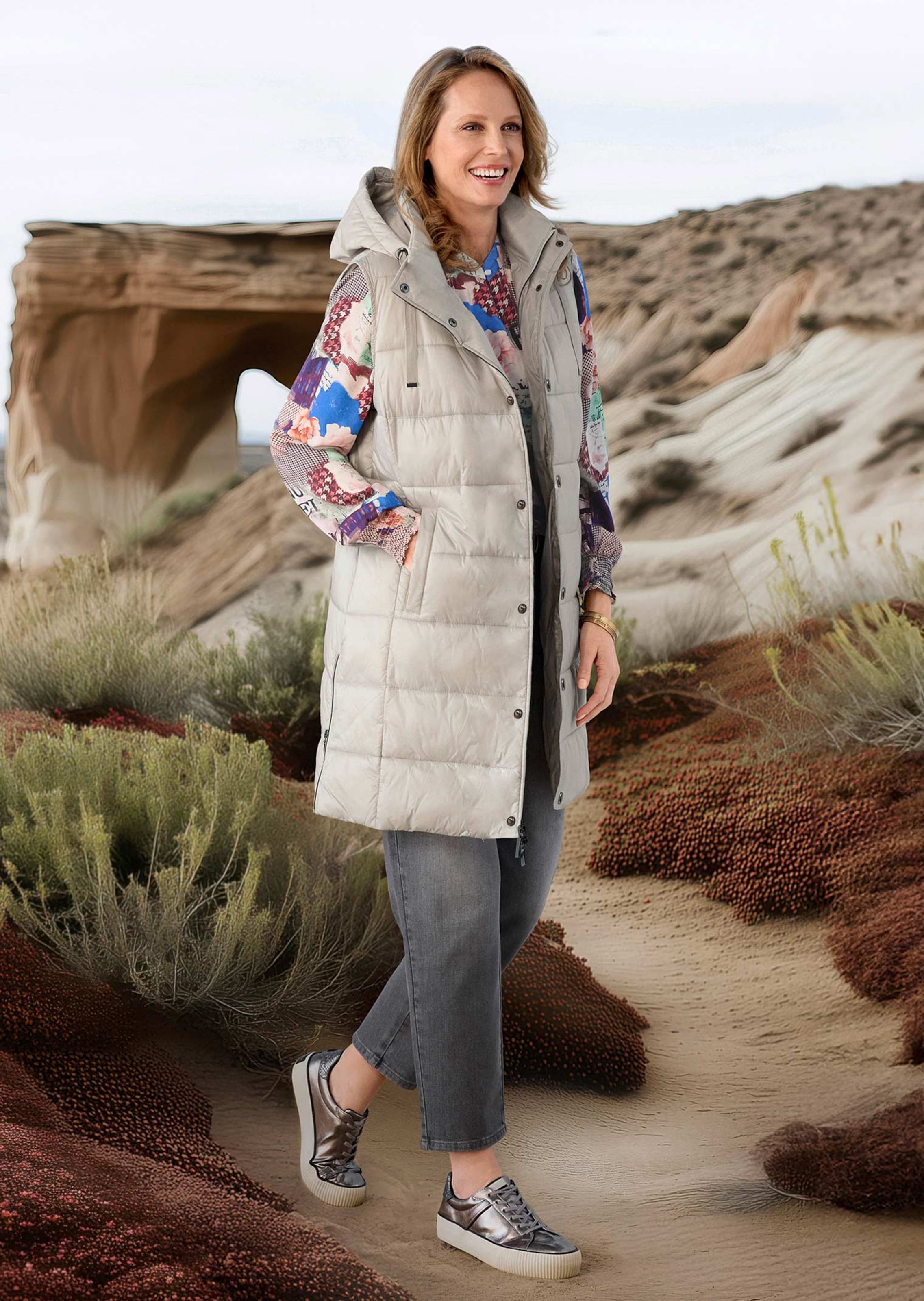 Des piqûres horizontales très mode parcourent ce gilet matelassé long en Nylon d'aspect brillant, chaudement doublé malgré son aspect svelte. De larges rubans décoratifs ton sur ton permettent d'ajuster la capuche. Fermeture par zip va-et-vient et boutons-pression, fentes zippées sur les côtés. Longueur env. 89 cm en 46, env. 85 cm en 23.