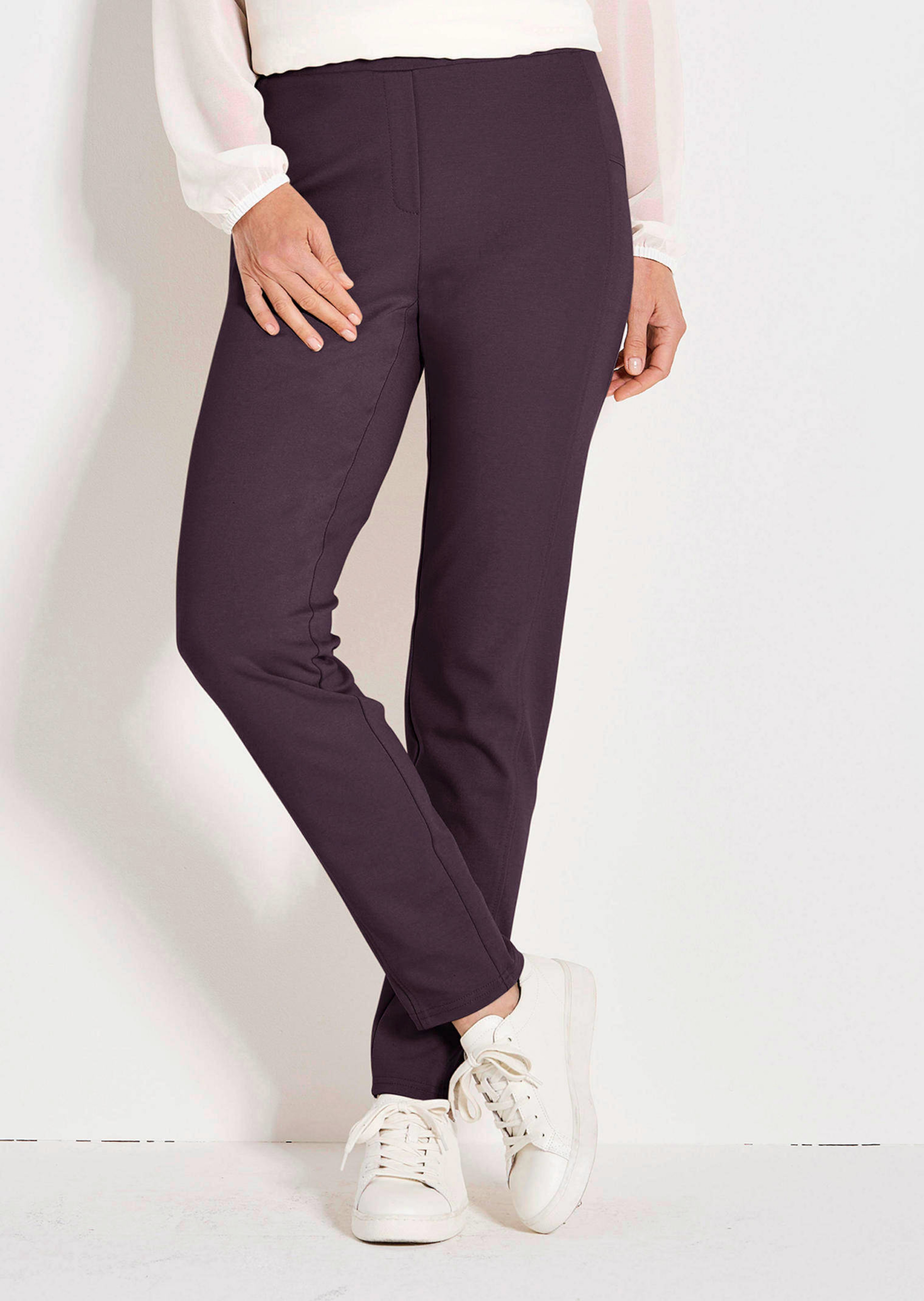 Pantalon en jersey BELLA avec ceinture élastique intégrée – très confortable, ne comprime pas. Coupé dans une viscose extensible de qualité Punto-di-Roma qui tombe élégamment. Coupe slim, inserts latéraux qui élancent et pinces à l'arrière pour une tenue parfaite. Zip décoratif. Largeur au bas env. 34 cm. Coupe ultra ajustée.