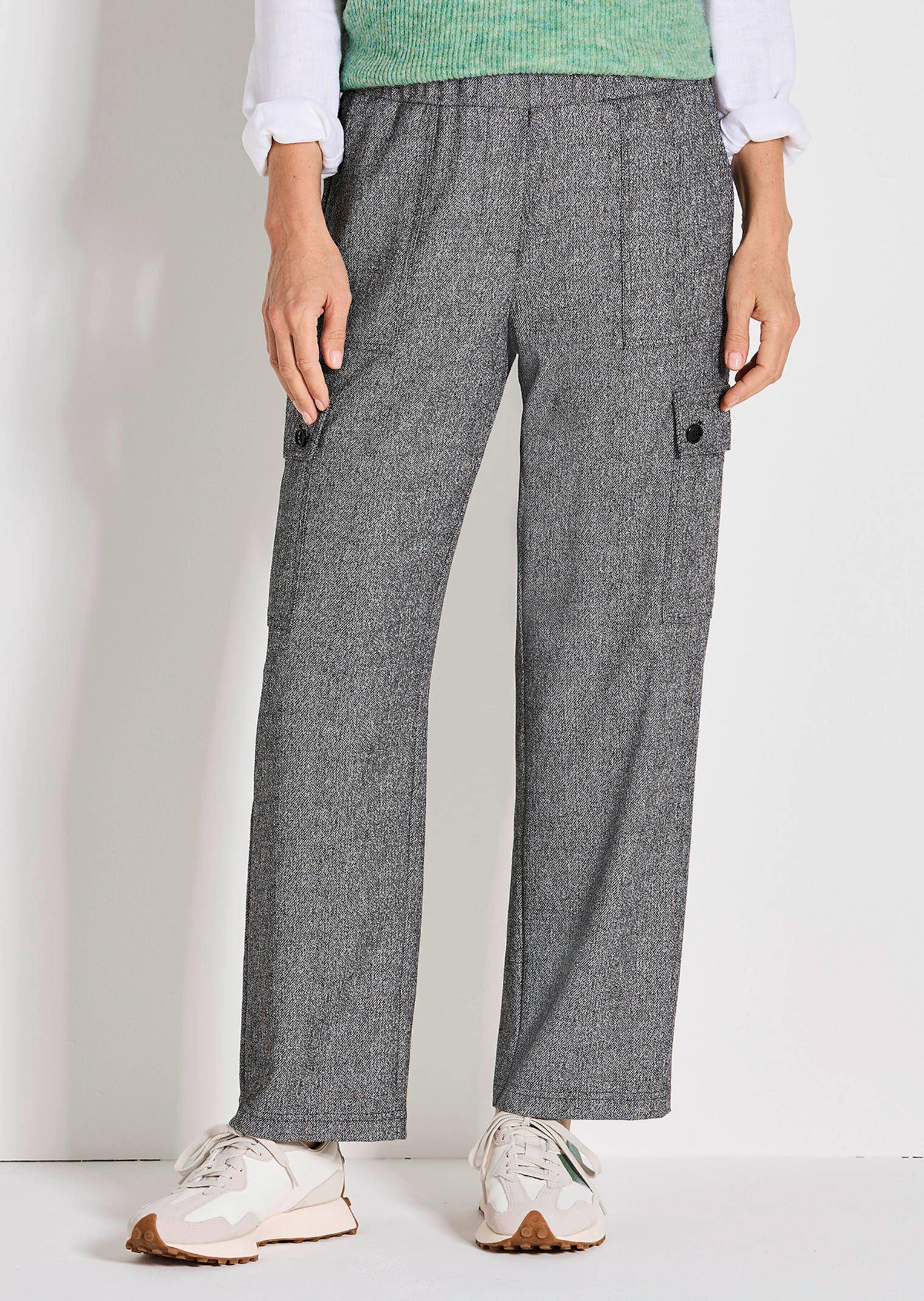 Pantalon cargo VERA avec taille entièrement élastique. Avec détails typiques tels que poches plaquées, poches au dos, poches à rabat boutonné sur les côtés. Tous les éléments cargo et le zip suggéré sont bien plats et ne transparaissent. Belle matière extensible, coloris poivre et sel, avec teneur élevée en viscose. Largeur au bas env. 50 cm. Jambes amples.