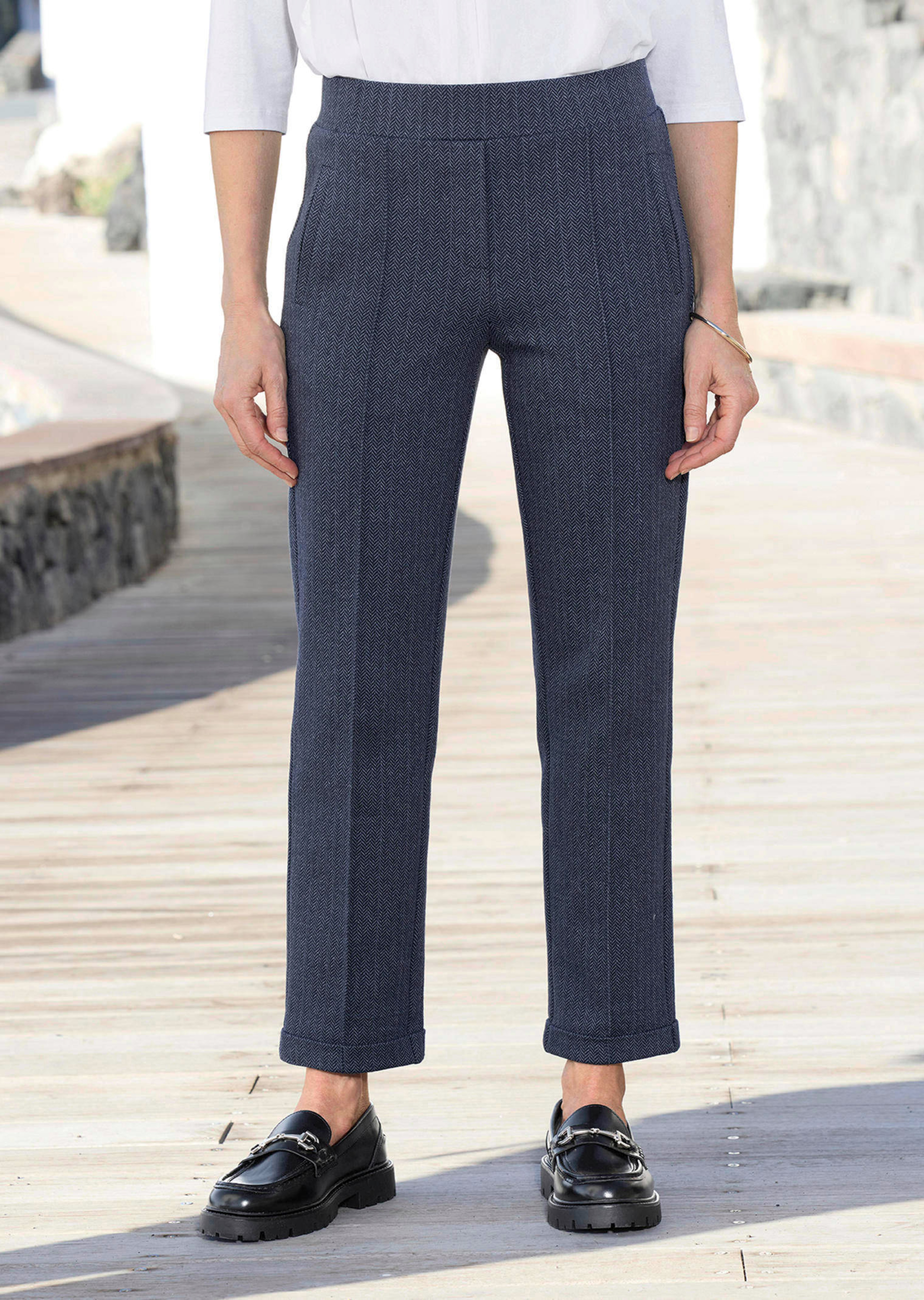 Pantalon CARLA avec taille entièrement élastique, et zip factice. Jersey extensible doux, très agréable à porter, avec teneur en coton. Deux poches, plis nervurés à effet allongeant et petit revers à la base. Avec motif à chevrons soigné garantissant une allure impeccable. Largeur au bas env. 42 cm. Jambes droites.