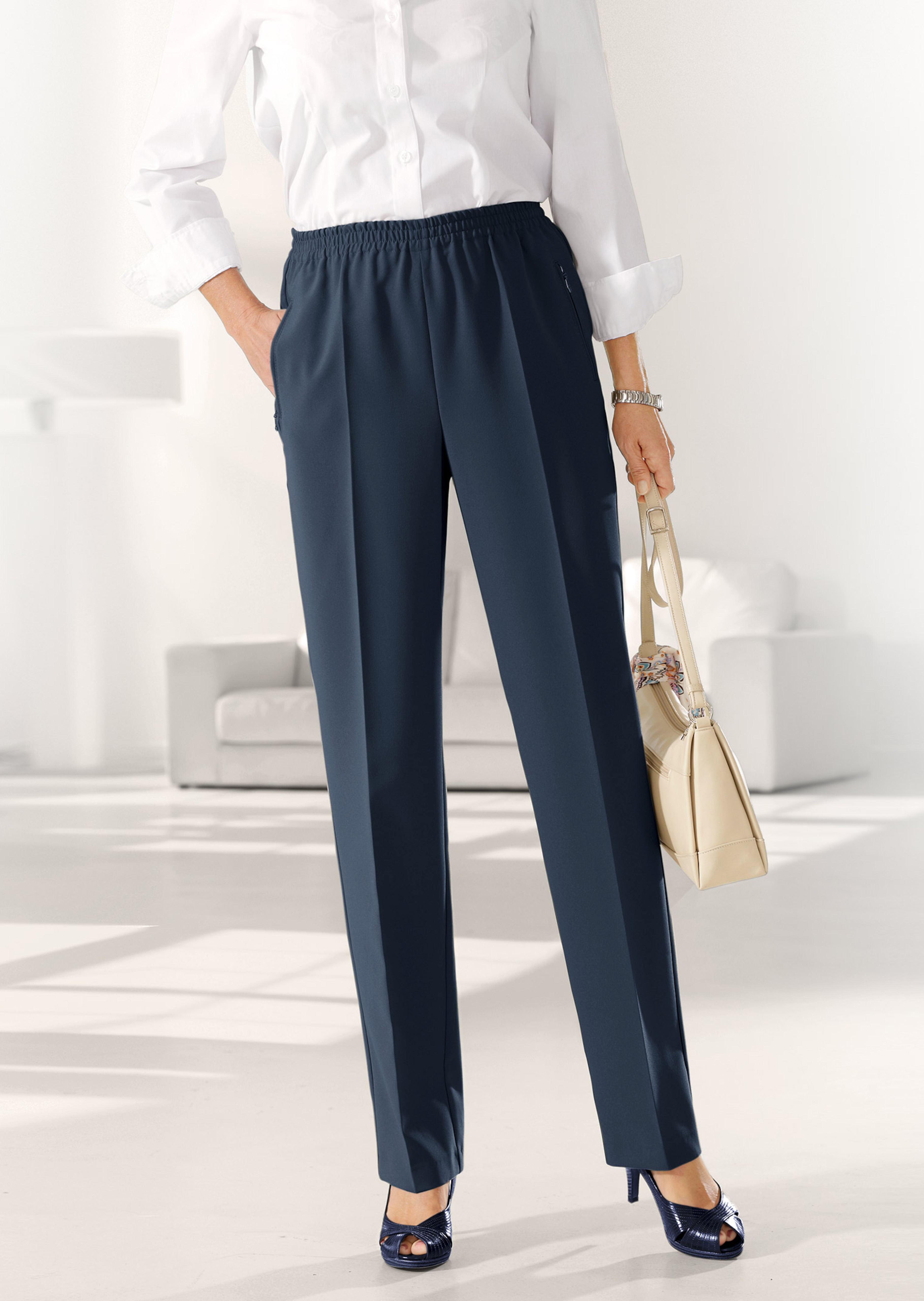 Pantalon de voyage CARLA à taille entièrement élastique, idéal pour les voyages ou les longues sessions assises, un indispensable de votre garde-robe. Grâce à sa taille élastique, il n'irrite ni ne serre au niveau du ventre. Le tissu, adapté aux voyages en valise, est quasiment infroissable et très facile d'entretien. Il est orné d'un élégant pli marqué pour un look soigné. Largeur au bas env. 44 cm. Coupe droite.