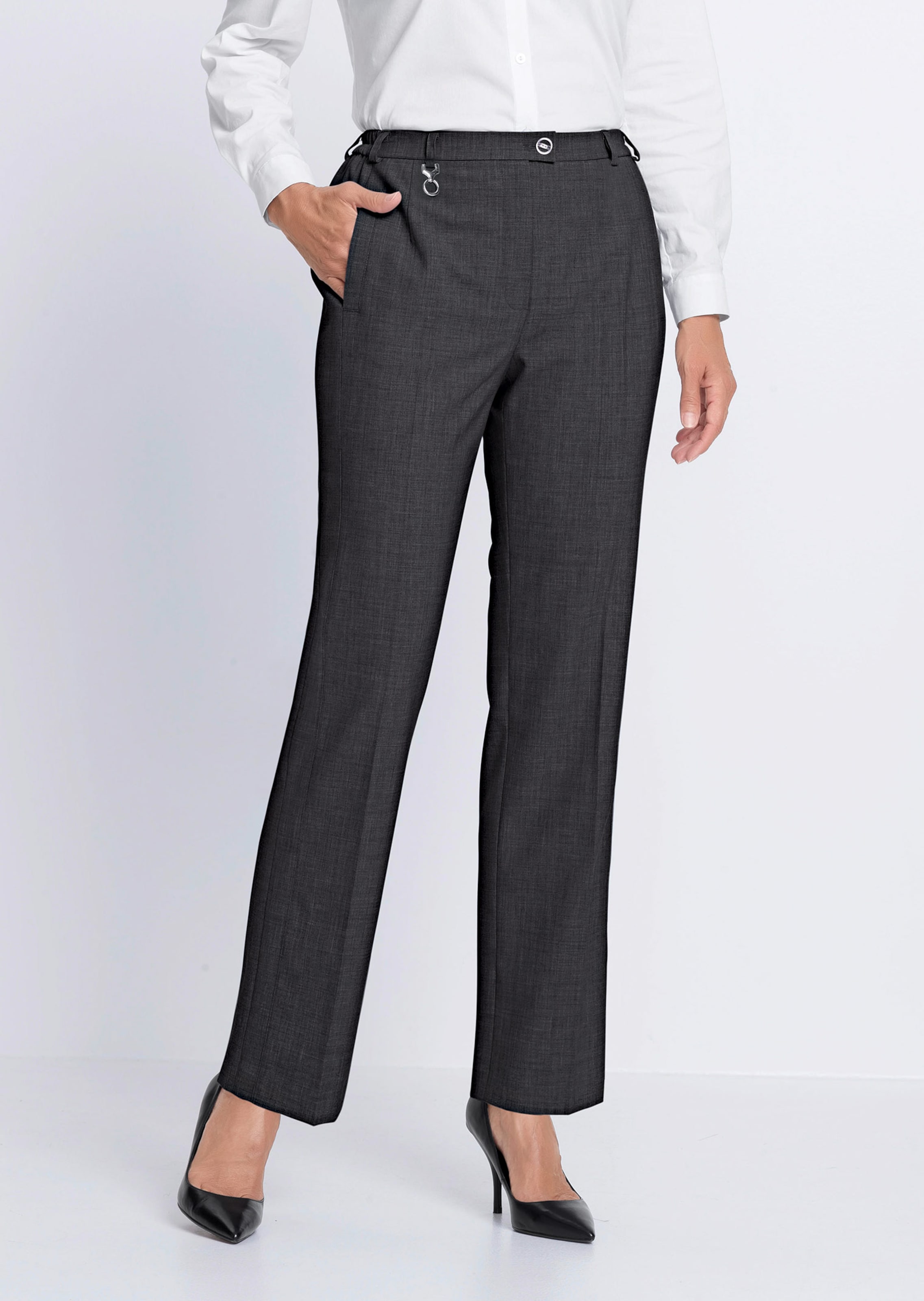 Pantalon en laine vierge CARLA COMFORT+. Modèle parfaitement seyant, très confortable, confectionné en tissu Trevira indéformable et facile d’entretien. La taille partiellement élastique s’adapte à votre morphologie. Confection soignée avec passants pour ceinture dont l'un est orné d’un élément décoratif, poches et plis raffinés. Largeur au bas env. 44 cm. Coupe droite.