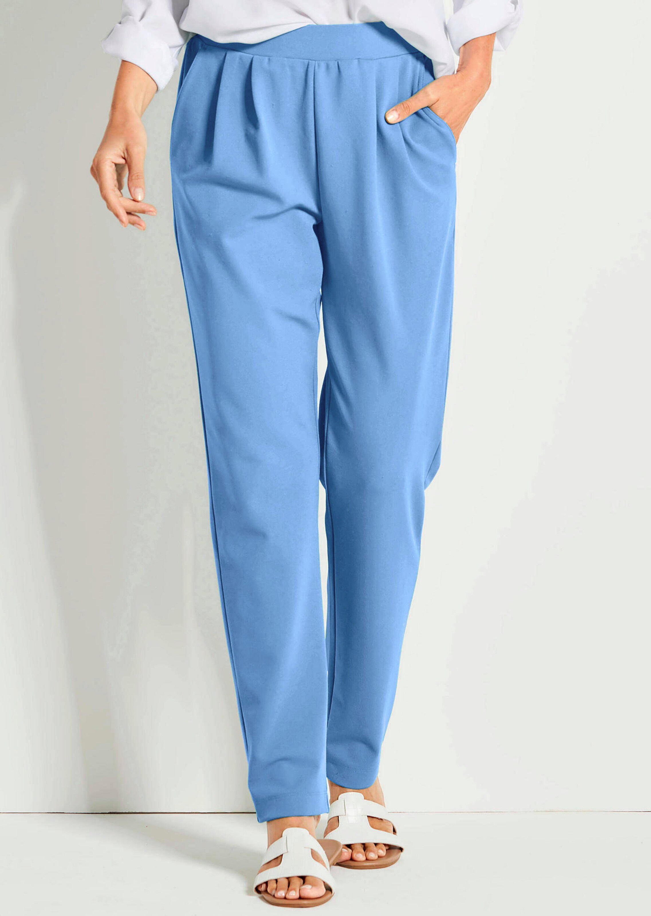 Le pantalon SARA à taille élastique lisse offre un confort incomparable toute la journée. Cela est dû à la matière bi-extensible et facile d'entretien qui présente des propriétés infroissables et thermorégulatrices. Avec des plis à la taille et des poches obliques. En qualité crêpe. Largeur au bas env. 34 cm. Coupe conique.