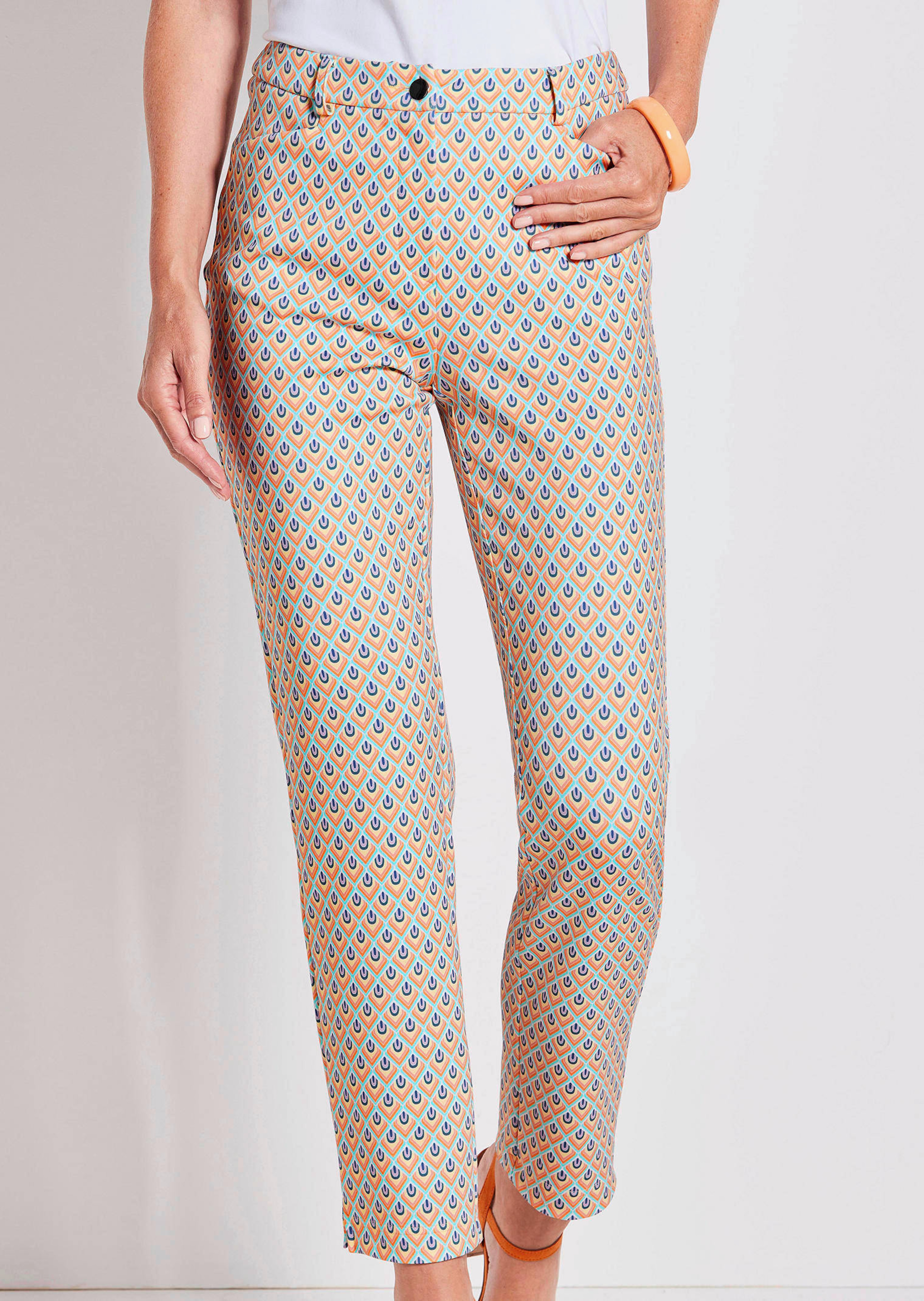 Pantalon imprimé LOUISA. Modèle raffiné, élégant, avec ceinture montée en forme agrémentée de passants. Matière extensible, légèrement brillante, au toucher noble. Imprimé graphique aux coloris harmonieux. Coupe flatteuse, avec jambes ajustées à effet visuel allongeant. Poches pratiques en L. Largeur au bas env. 39 cm. Coupe ajustée.