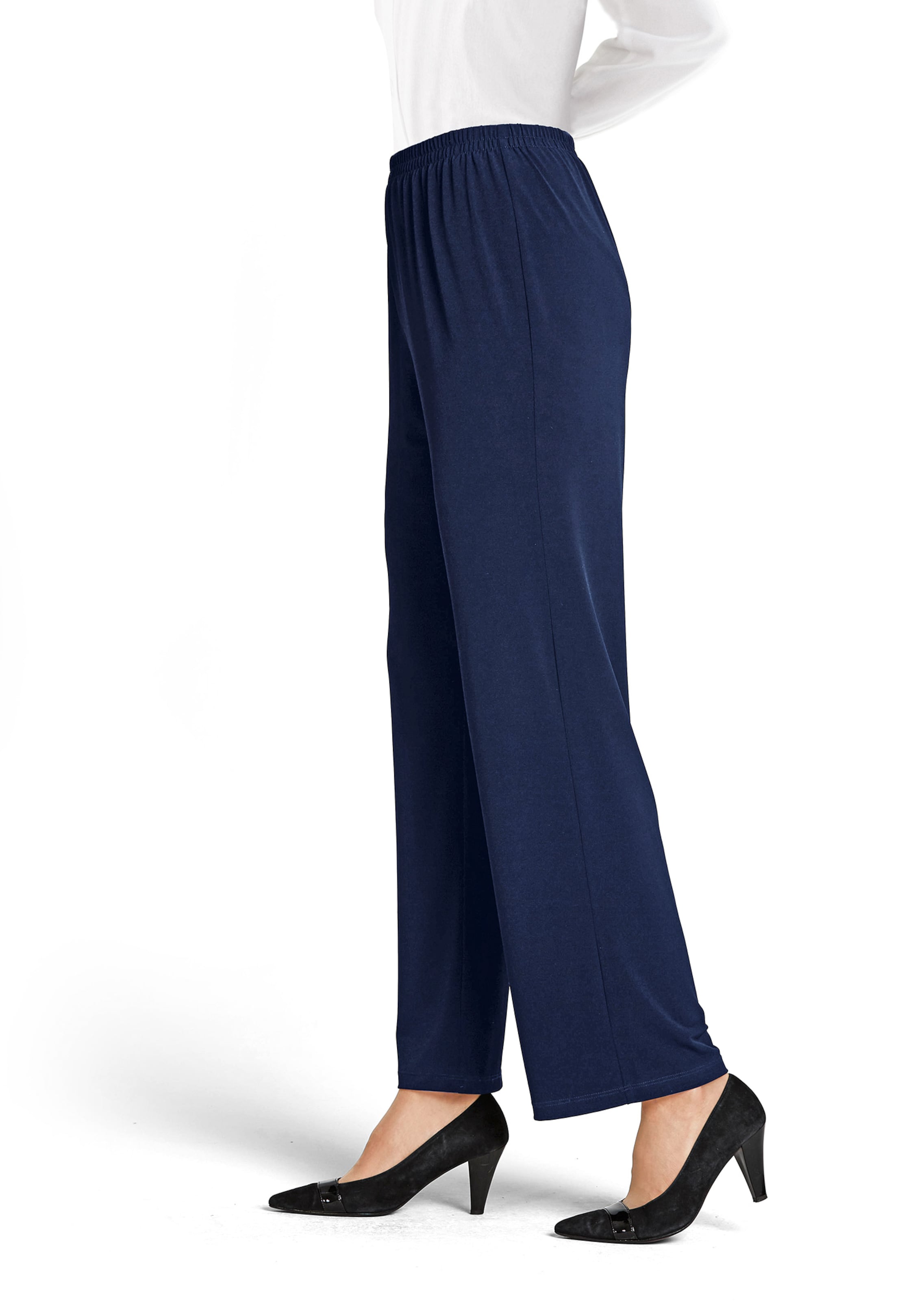 Pantalon slinky VERA à taille entièrement élastique et coupe ample - très confortable et facile à porter. Il est coupé dans une matière extensible et facile d'entretien : il suffit de le laver, de le sécher et de l'enfiler, le repassage est inutile. La taille élastique assure un confort supplémentaire, car elle ne serre pas. Un partenaire mode idéal pour toutes les occasions ! Largeur au bas env. 50 cm. Coupe large.