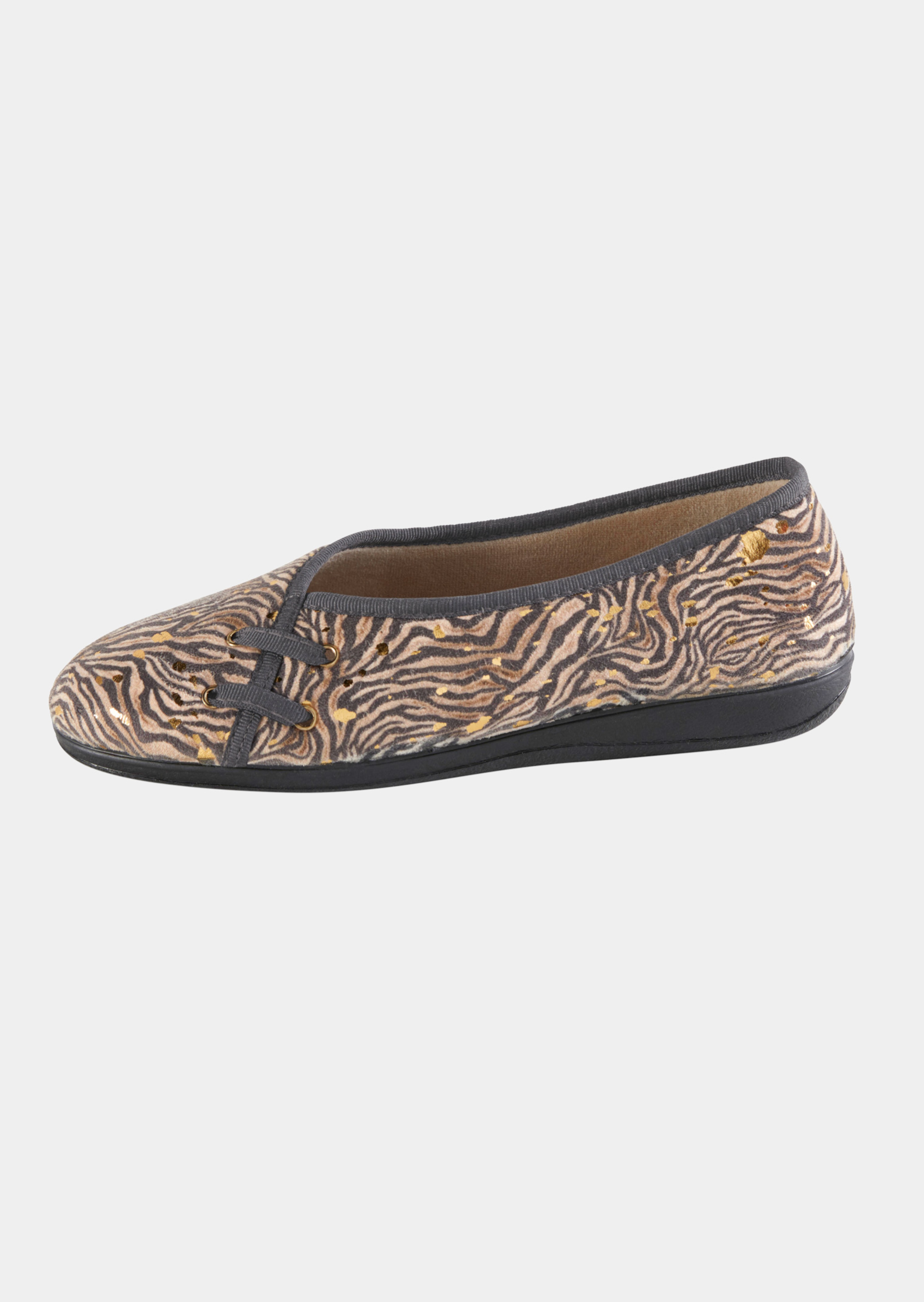 Pantoufles en largeur F avec imprimé animalier du plus bel effet. Un must pour les fashionistas qui veulent aussi afficher leur style à la maison. Avec laçage raffiné et motif zébré agrémenté de détails brillants en métal. Forme élégante typique, façon ballerine, parfaitement adaptée aux pieds fins. Avec semelle antidérapante en caoutchouc véritable.