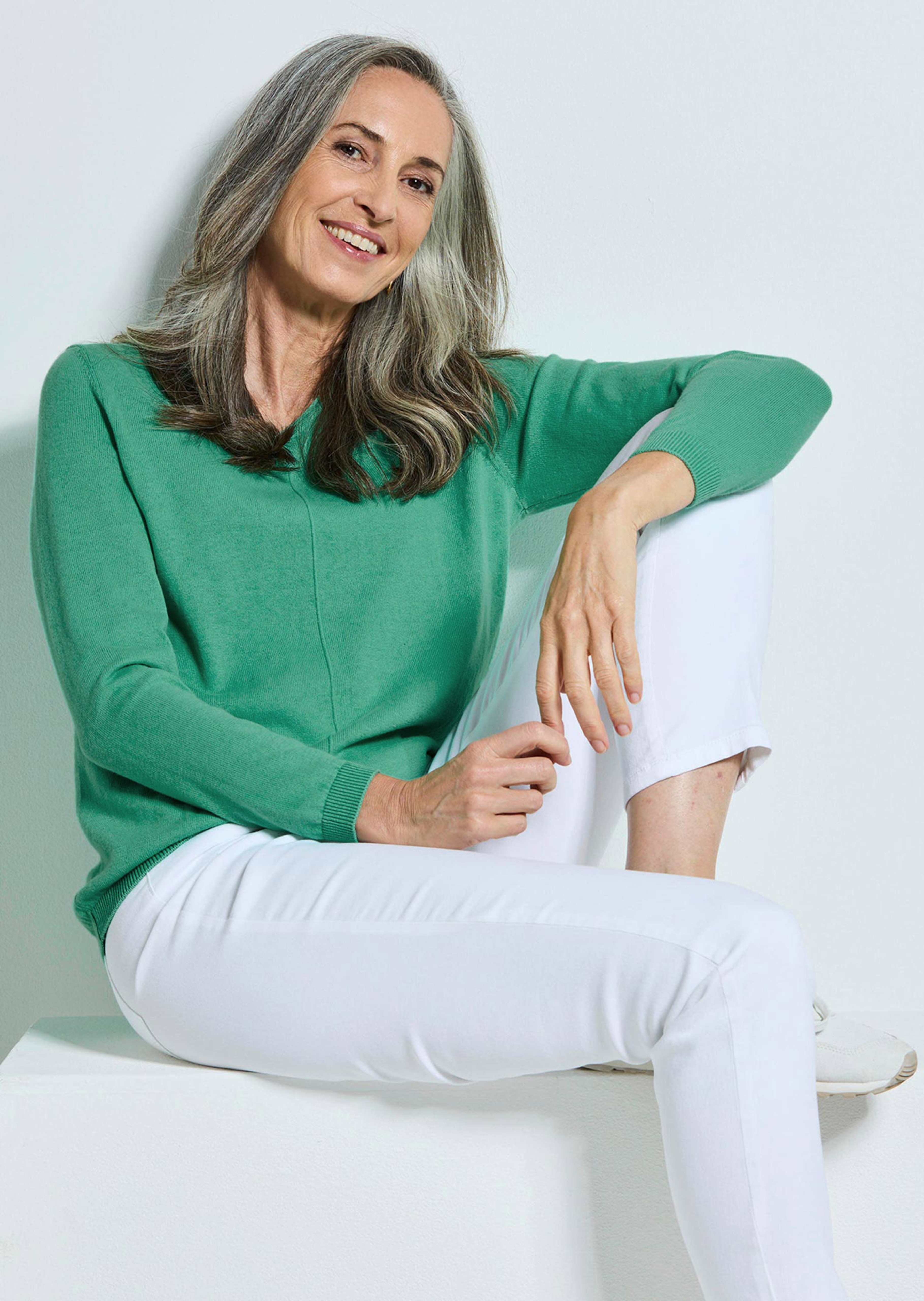 Pull à encolure en V confectionnée dans en COTTAMIRA une matière de belle qualité en pur coton sublimé de cachemire dont l'éclat naturel et le toucher douillet séduisent d'emblée. La nervure décorative devant, au centre, allonge la silhouette visuellement. Encolure à bord roulotté, manches longues et finitions côtelées. La forme droite jusqu'aux hanches flatte avantageusement la silhouette. Longueur env. 67 cm en 46, env. 63 cm en 23.