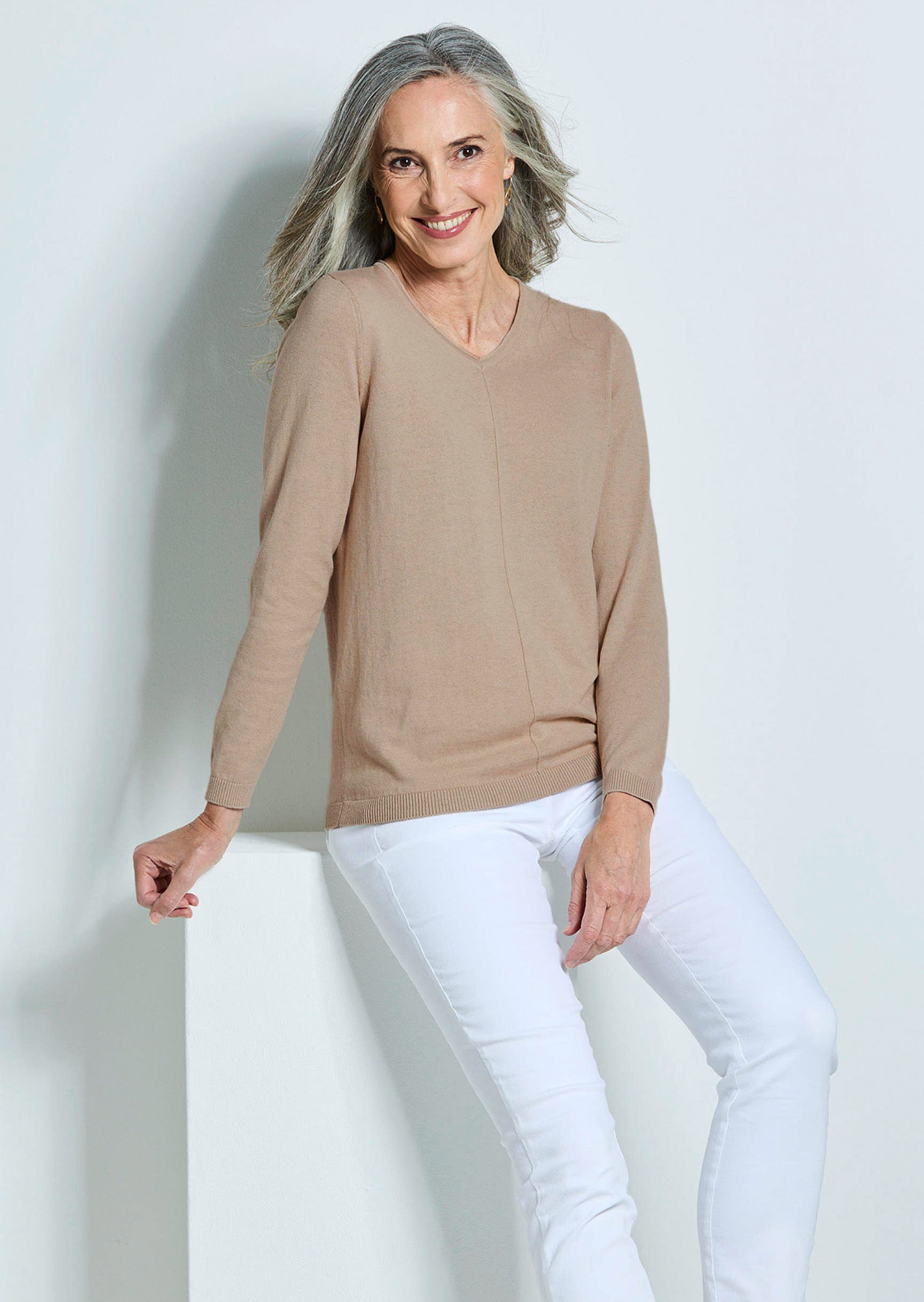 Pull à encolure en V confectionnée dans en COTTAMIRA une matière de belle qualité en pur coton sublimé de cachemire dont l'éclat naturel et le toucher douillet séduisent d'emblée. La nervure décorative devant, au centre, allonge la silhouette visuellement. Encolure à bord roulotté, manches longues et finitions côtelées. La forme droite jusqu'aux hanches flatte avantageusement la silhouette. Longueur env. 67 cm en 46, env. 63 cm en 23.