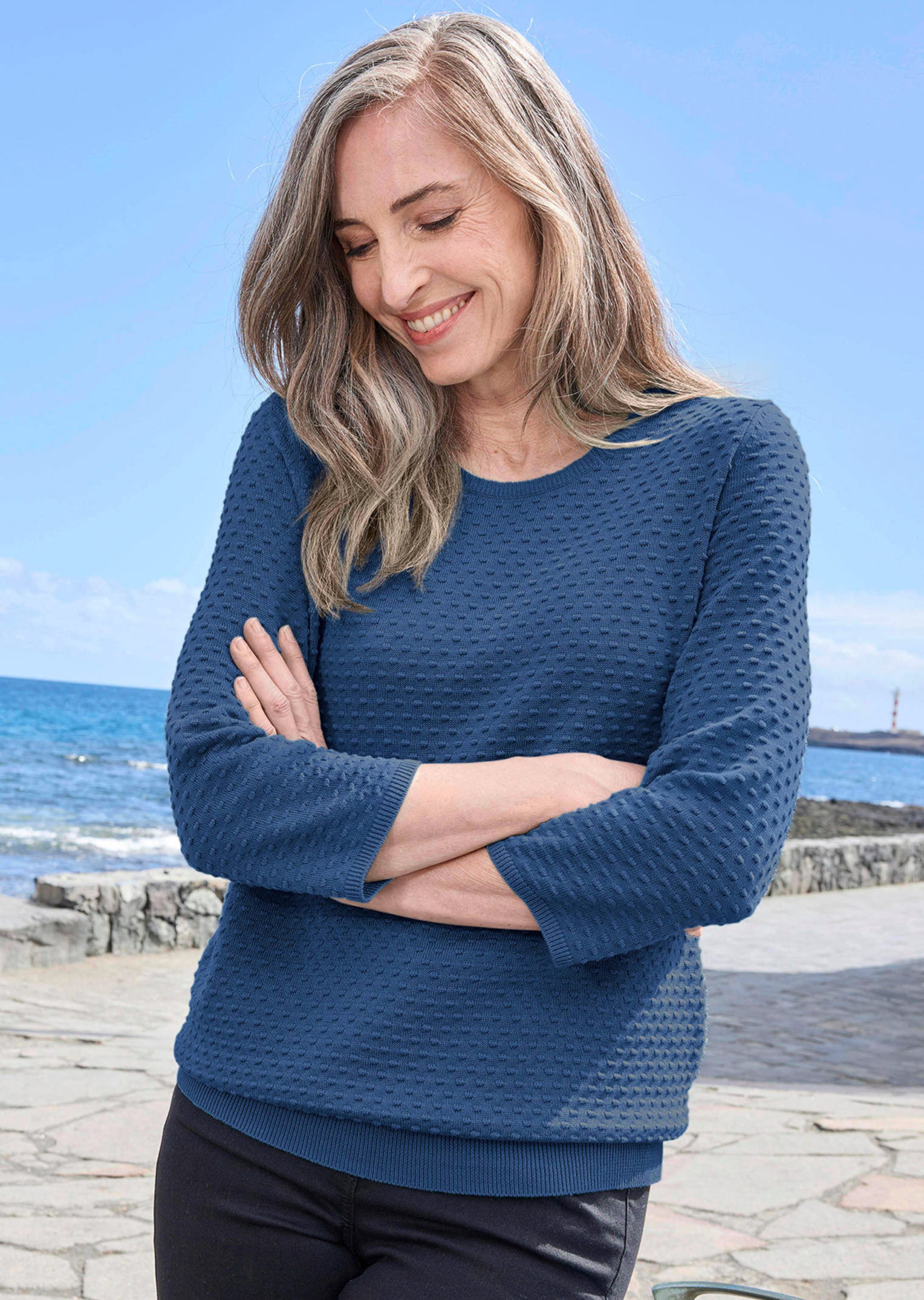 Pull en tricot à pois structuré du plus bel effet ! Pull en tricot fin, pur coton, très agréable au toucher. Confection soignée, tricotée en forme, encolure et manches 3/4 agrémentées d’un bord côtes. Longueur env. 65 cm en 46, env. 61 cm en 23.