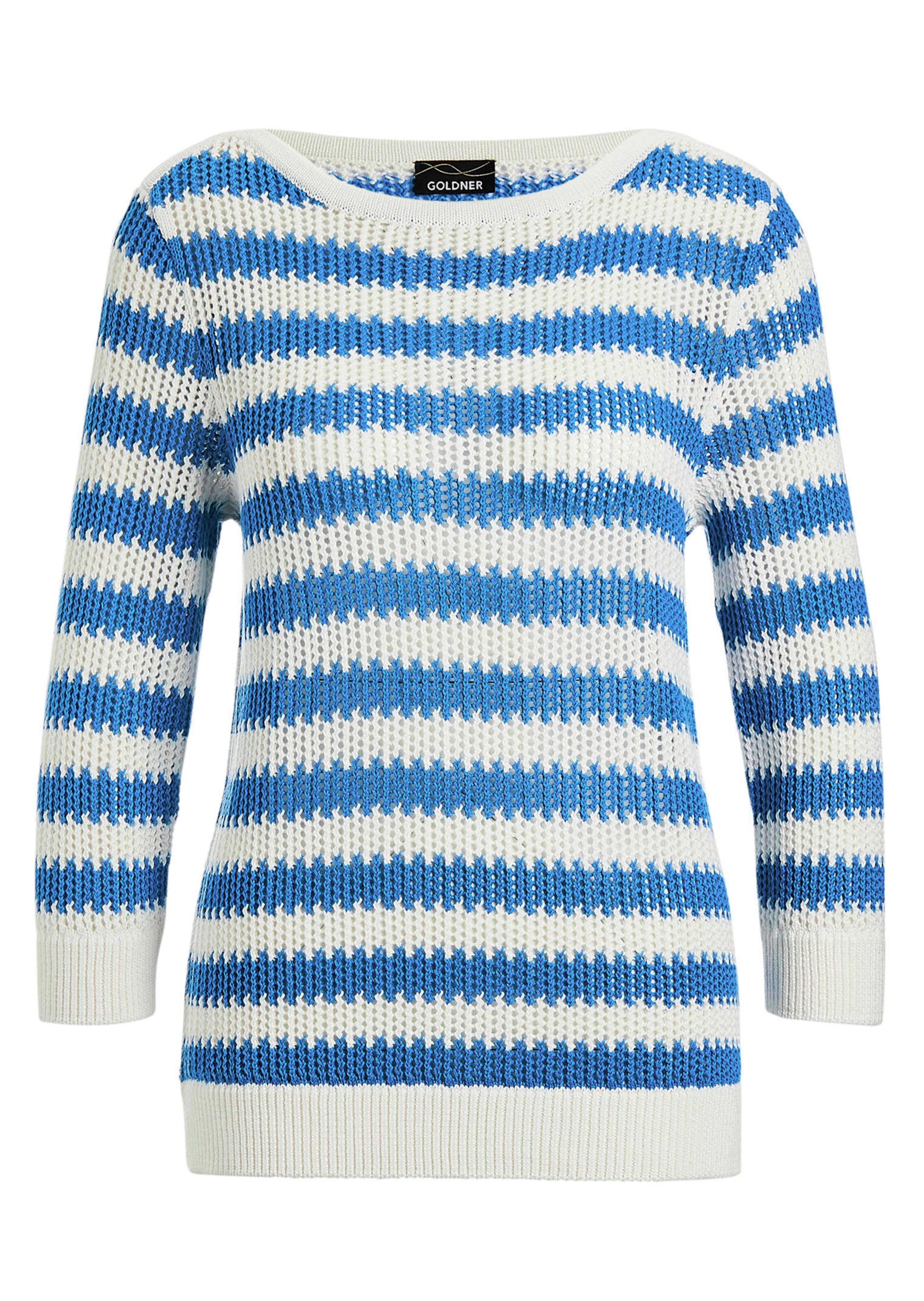 Pull en tricot à larges bandes contrastantes. Maille structurée ajourée, légère, du plus bel effet, très agréable à porter, avec teneur en coton. Forme droite à manches 3/4 avec bord côtes contrastant aux finitions. Encolure bateau soulignée d’une ganse lisse, contrastante, qui se poursuit d’une épaule à l’autre. Petites fentes latérales. Longueur env. 67 cm en 46, env. 63 cm en 23.