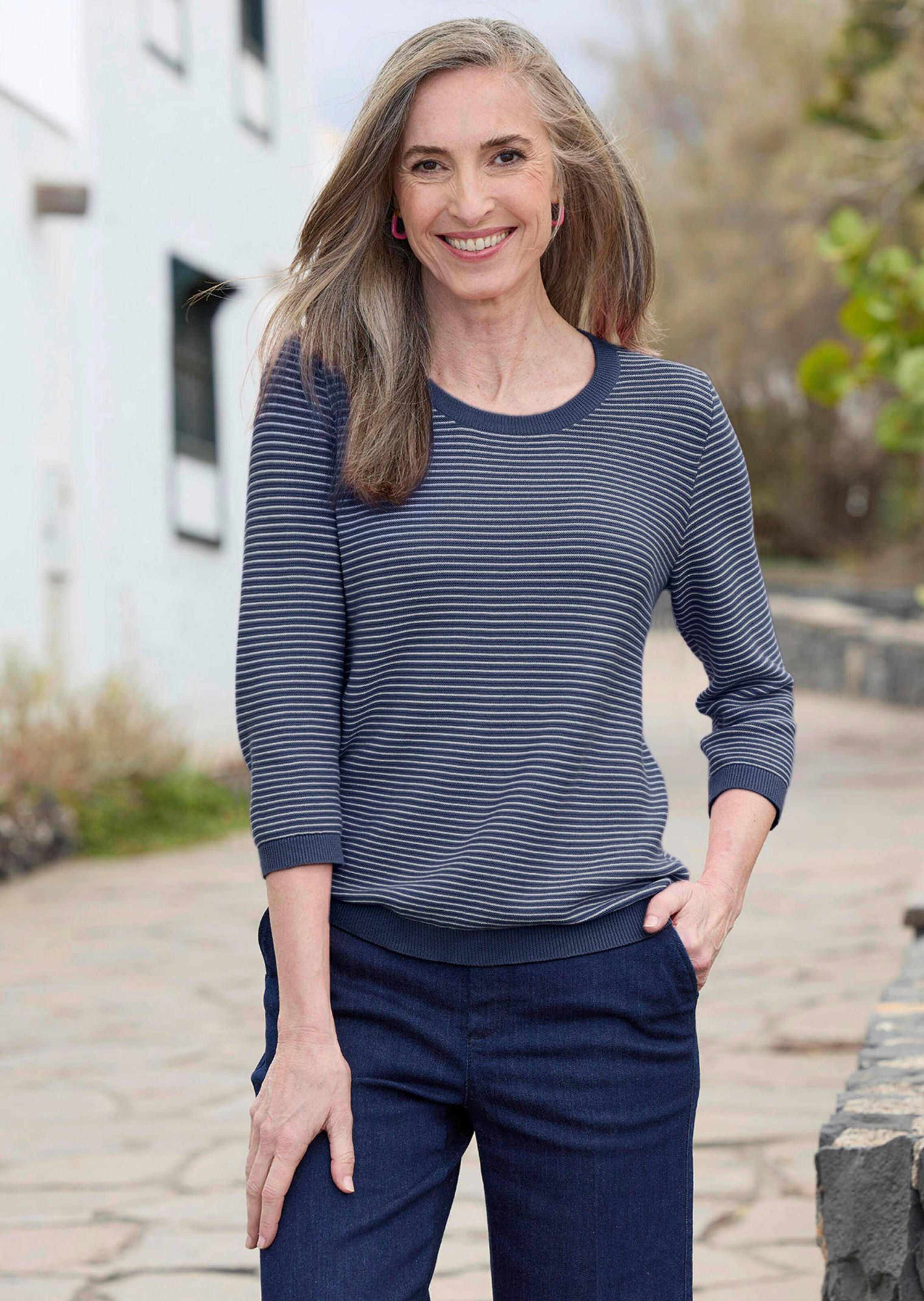 Pull en tricot avec motif à rayures bicolore. Belle maille à l’envers raffinée, aspect 3D, en pur coton agréable au toucher. Forme droite à manches 3/4. Encolure arrondie, bas des manches longues et base agrémentées d’un petit bord côtes. Longueur env. 65 cm en 46, env. 61 cm en 23.