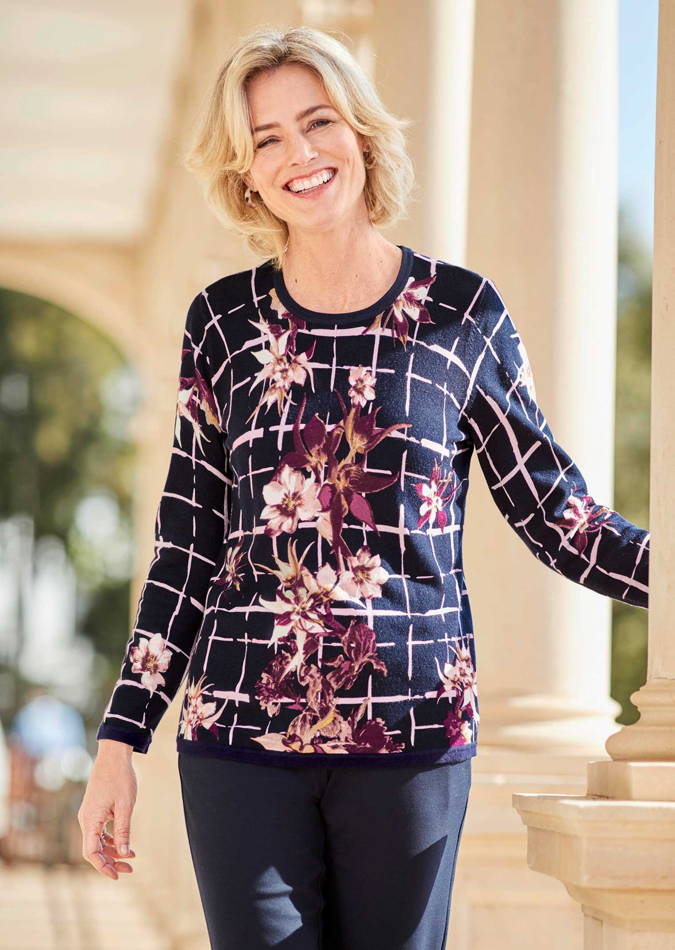Carreaux et fleurs se partagent la vedette sur ce pull imprimé en douce viscose mélangée, incomparablement agréable à porter. Coupe classique, encolure arrondie, manches longues, bords lisses. Longueur env. 67 cm en 46, env. 63 cm en 23.